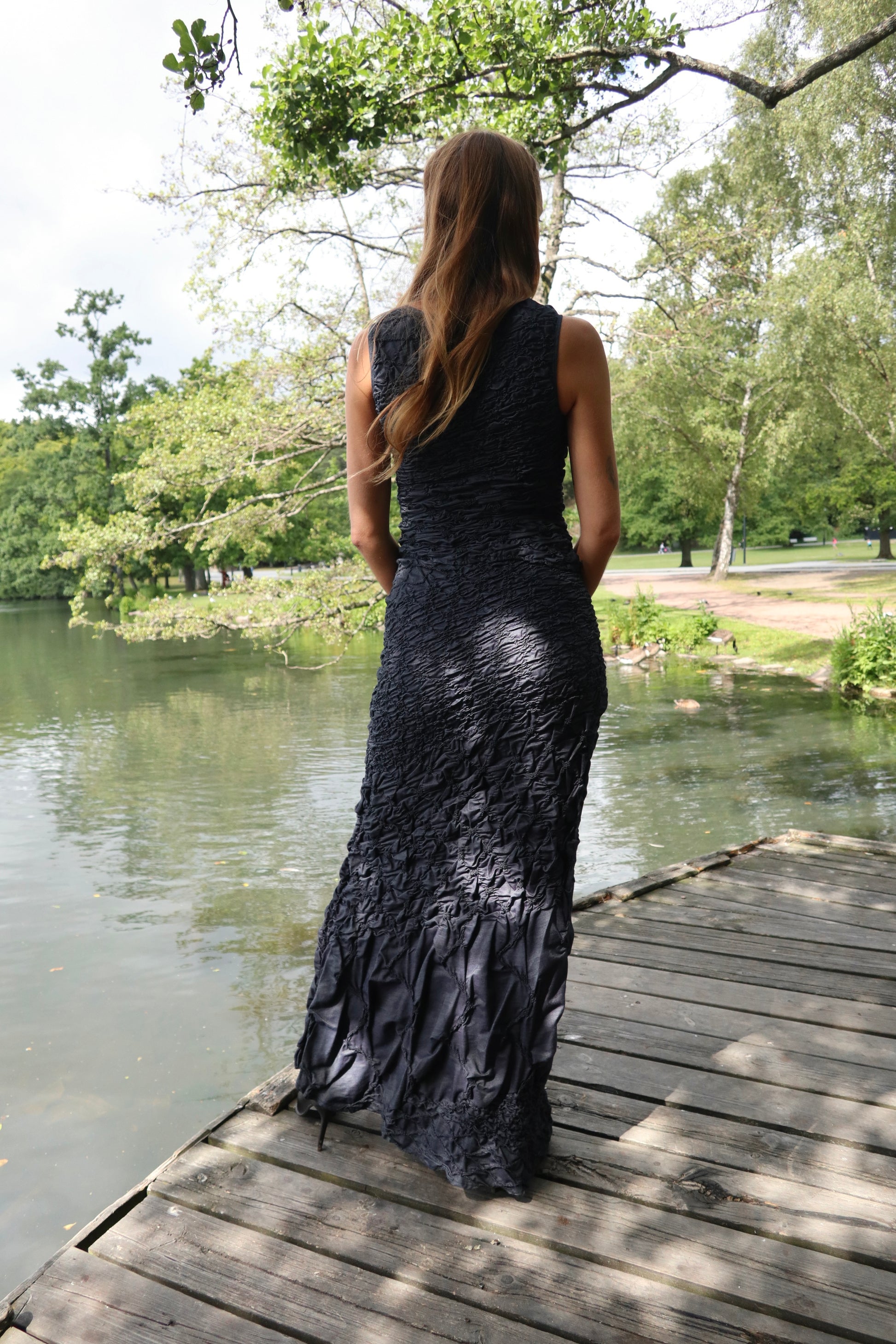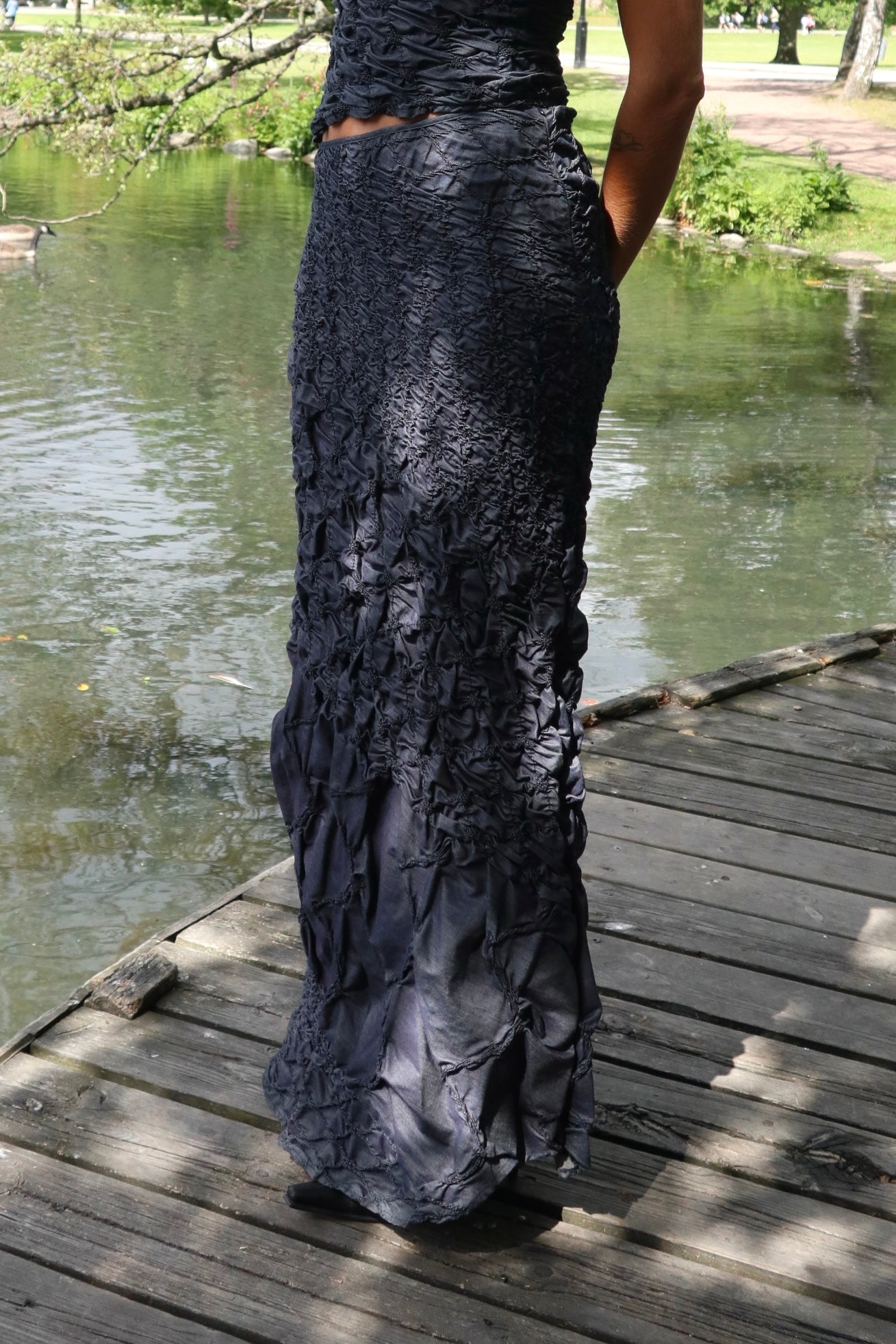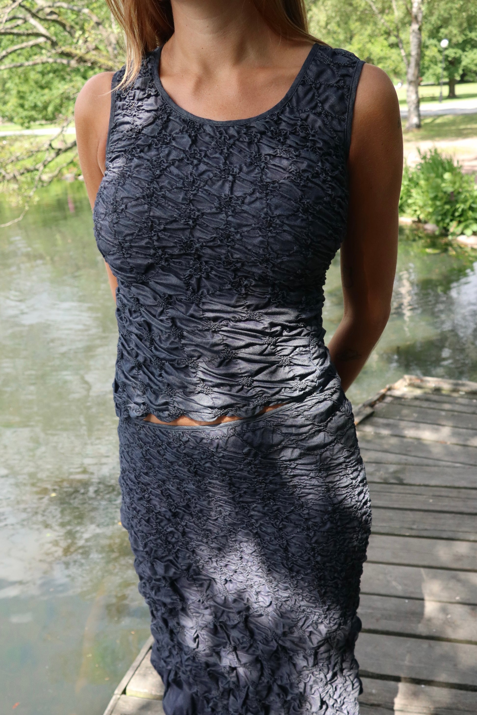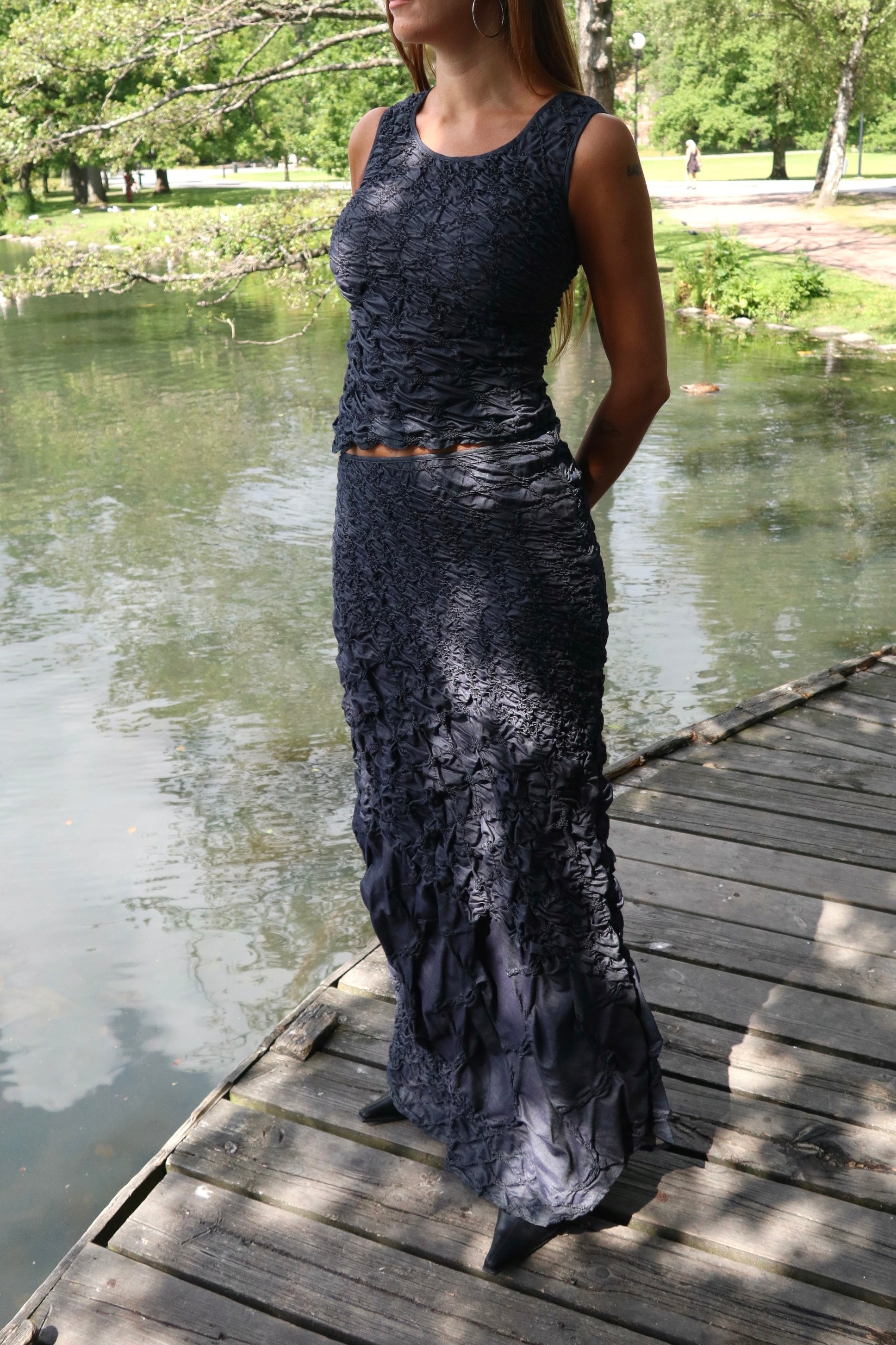 This rare Kenzo Jeans set is a sculptural statement in deep navy. Featuring a sleeveless stretch tank and matching crinkled maxi skirt, it plays with texture and movement in a subtly avant-garde silhouette.
