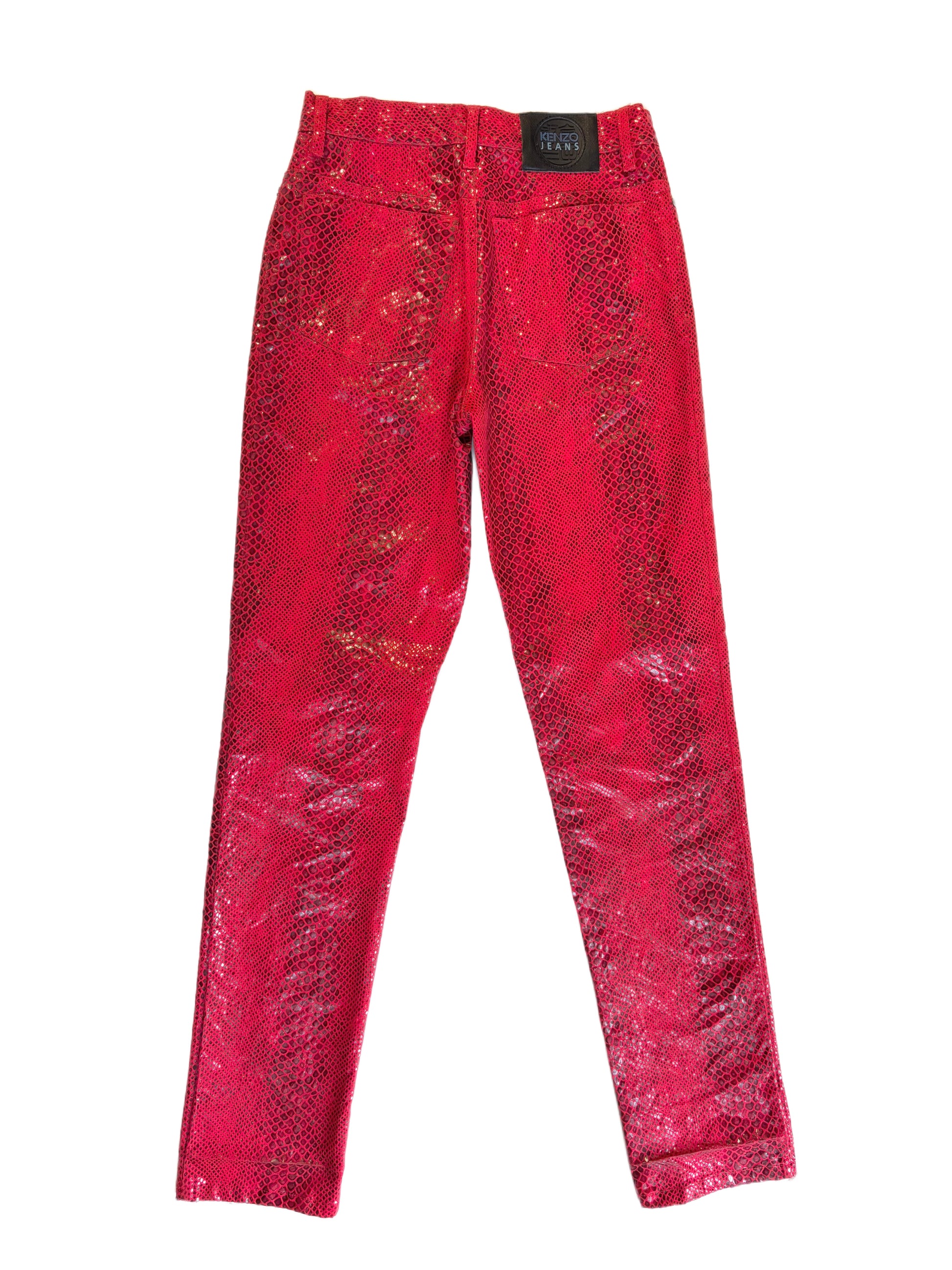 These vintage Kenzo red snakeskin-print trousers bring fierce 90s attitude with refined tailoring.