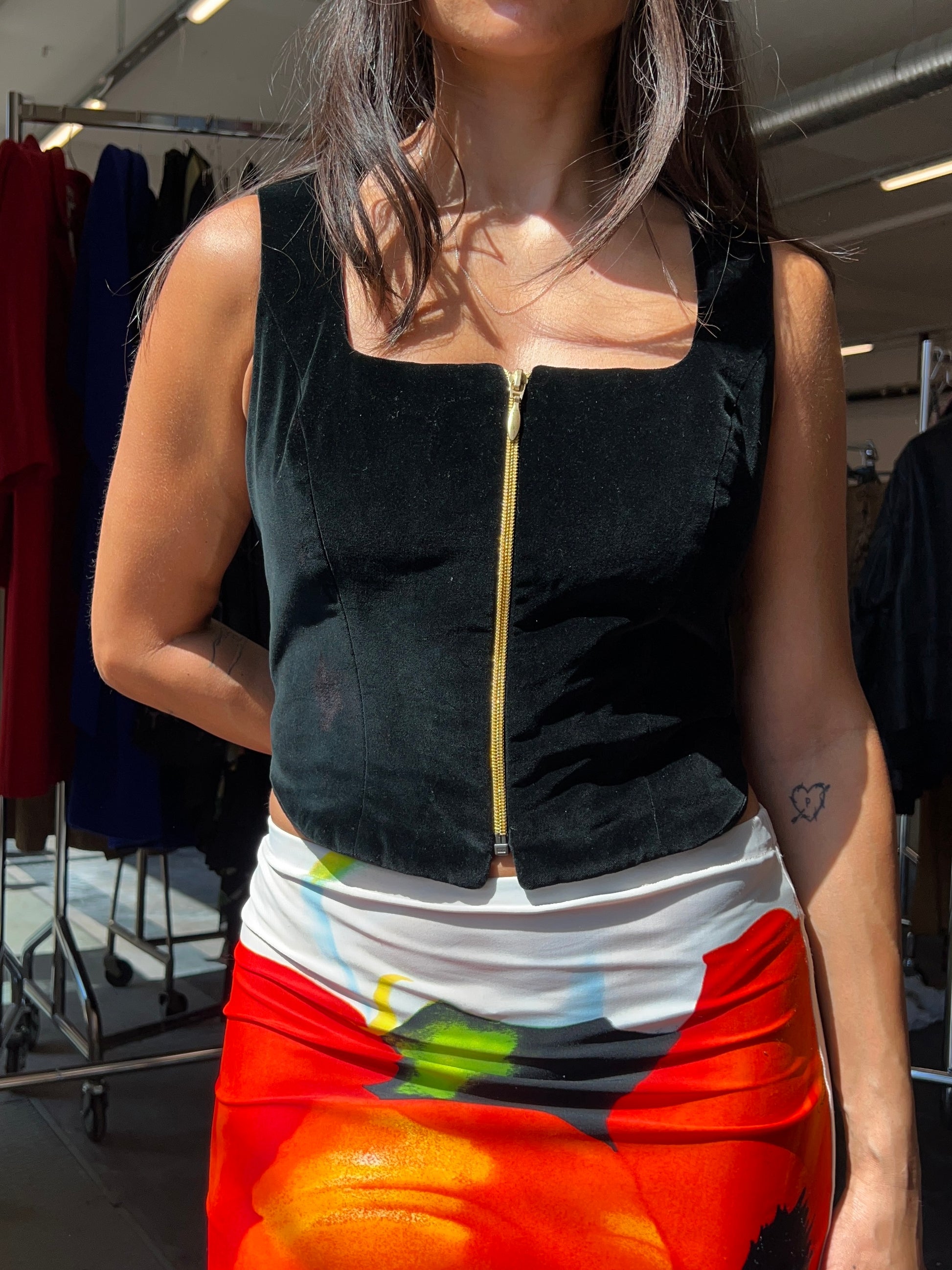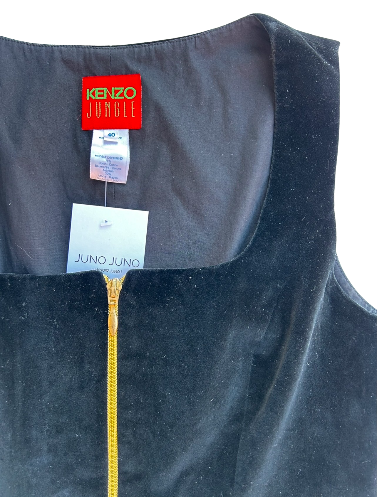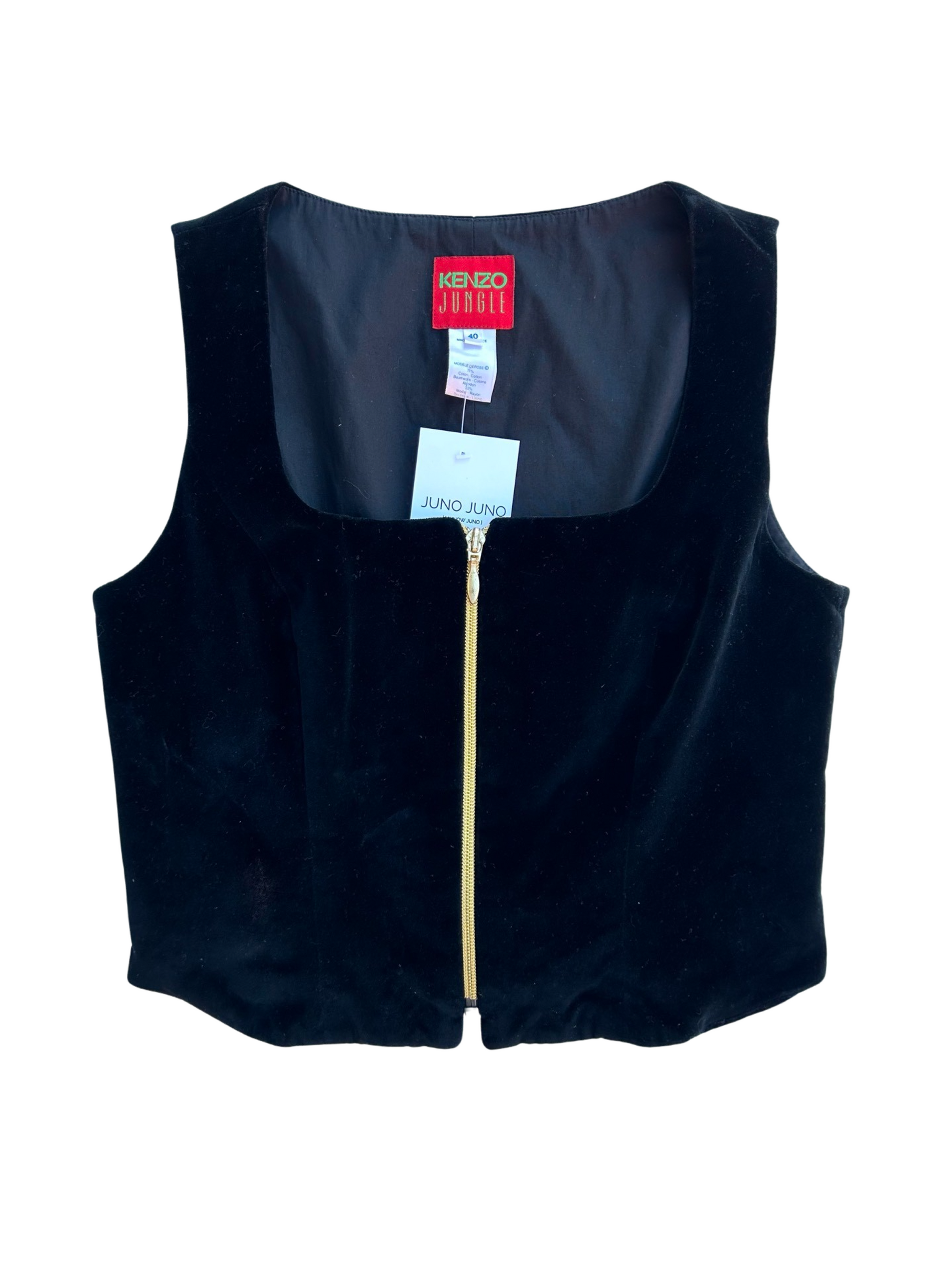 This romantic piece by Kenzo Jungle is a beautiful corset in luxurious black velvet and adorned with a golden zipper in the front. The fit is a flattering shape and the decorate is square shape.