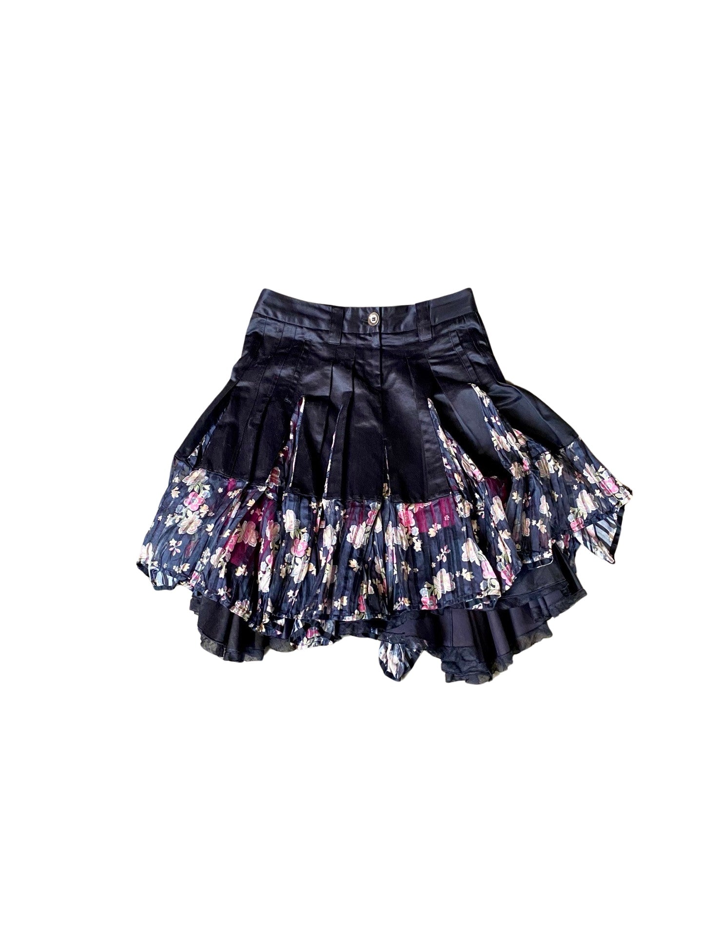 Shiny pleated silk skirt with sheer floral patterned flounce. Bright pink lining, button and zipper in the back. So lush and lovely!