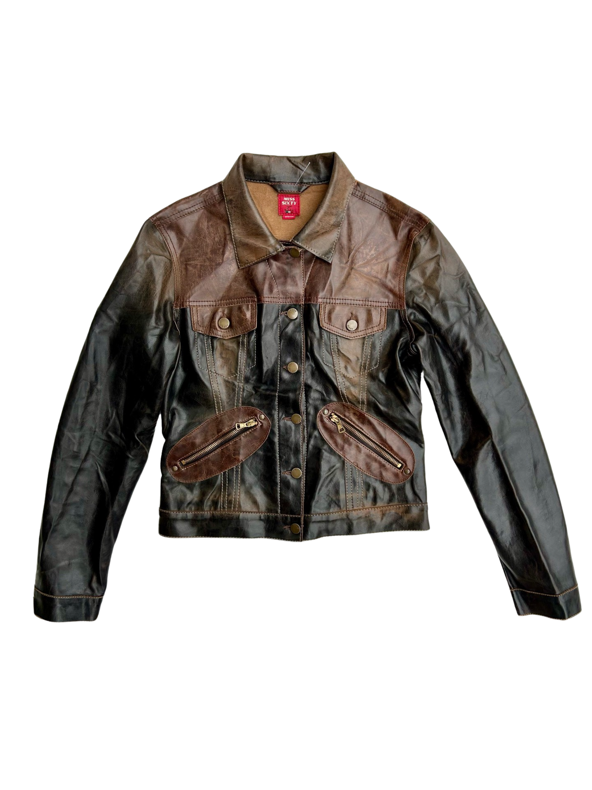 Rare Y2K Miss Sixty jacket in beautiful combination of brown leather colors. This jacket is as nice as an indoor jacket as it is as an outdoors. The details of distressed brown leather in combination with the light brown seems and brass zippers and buttons really gives this jacket that perfect vintage feel.
