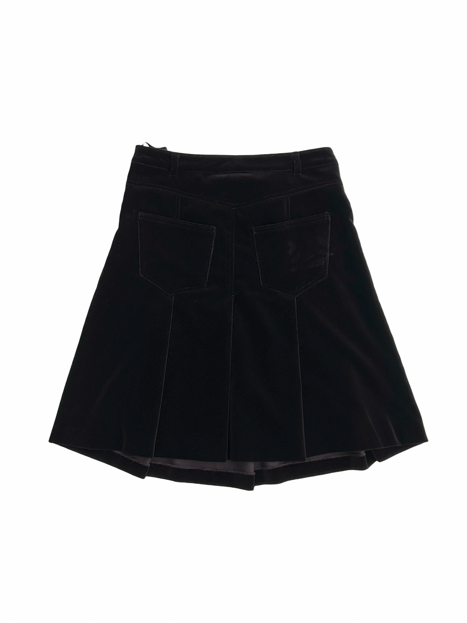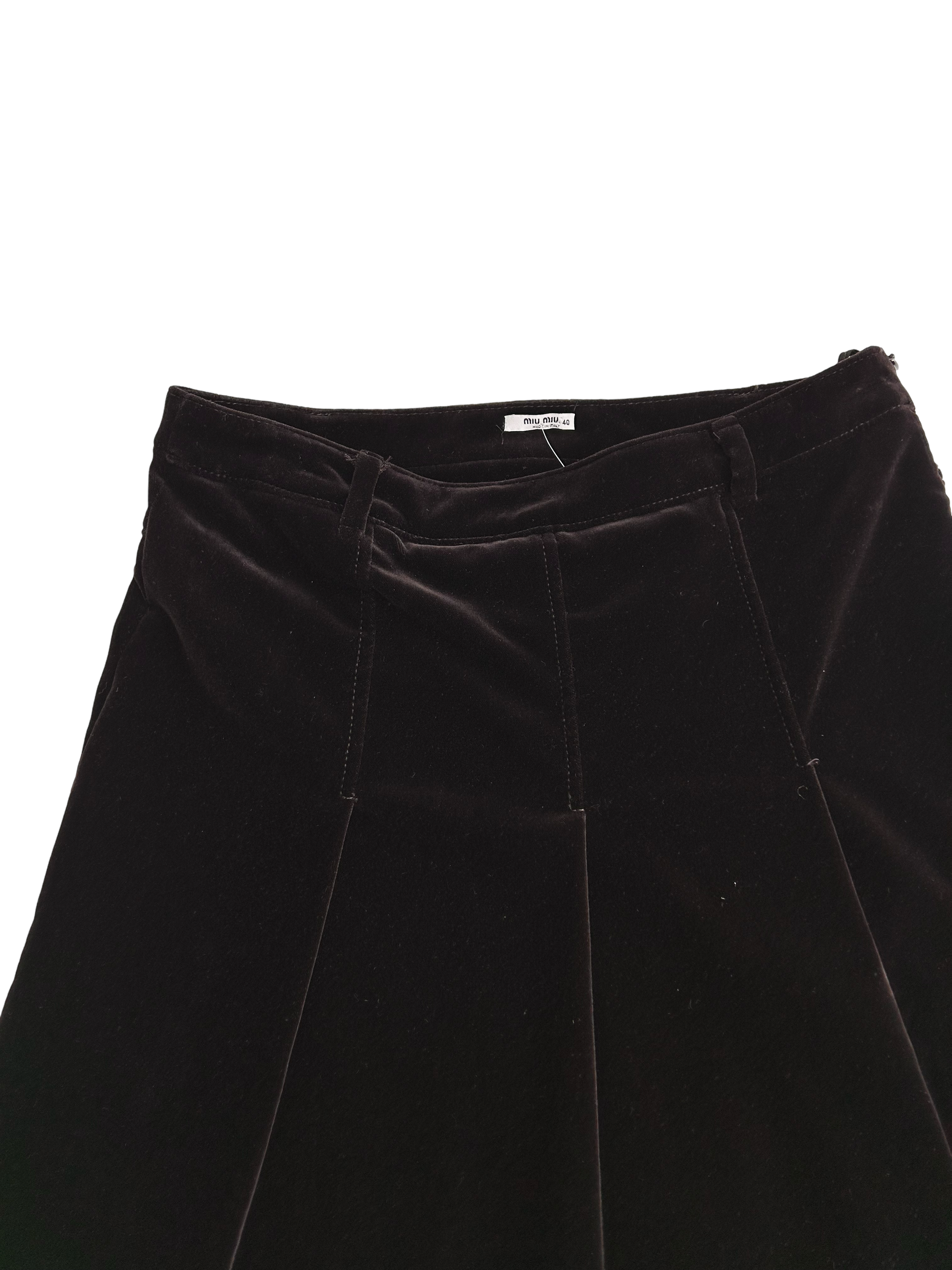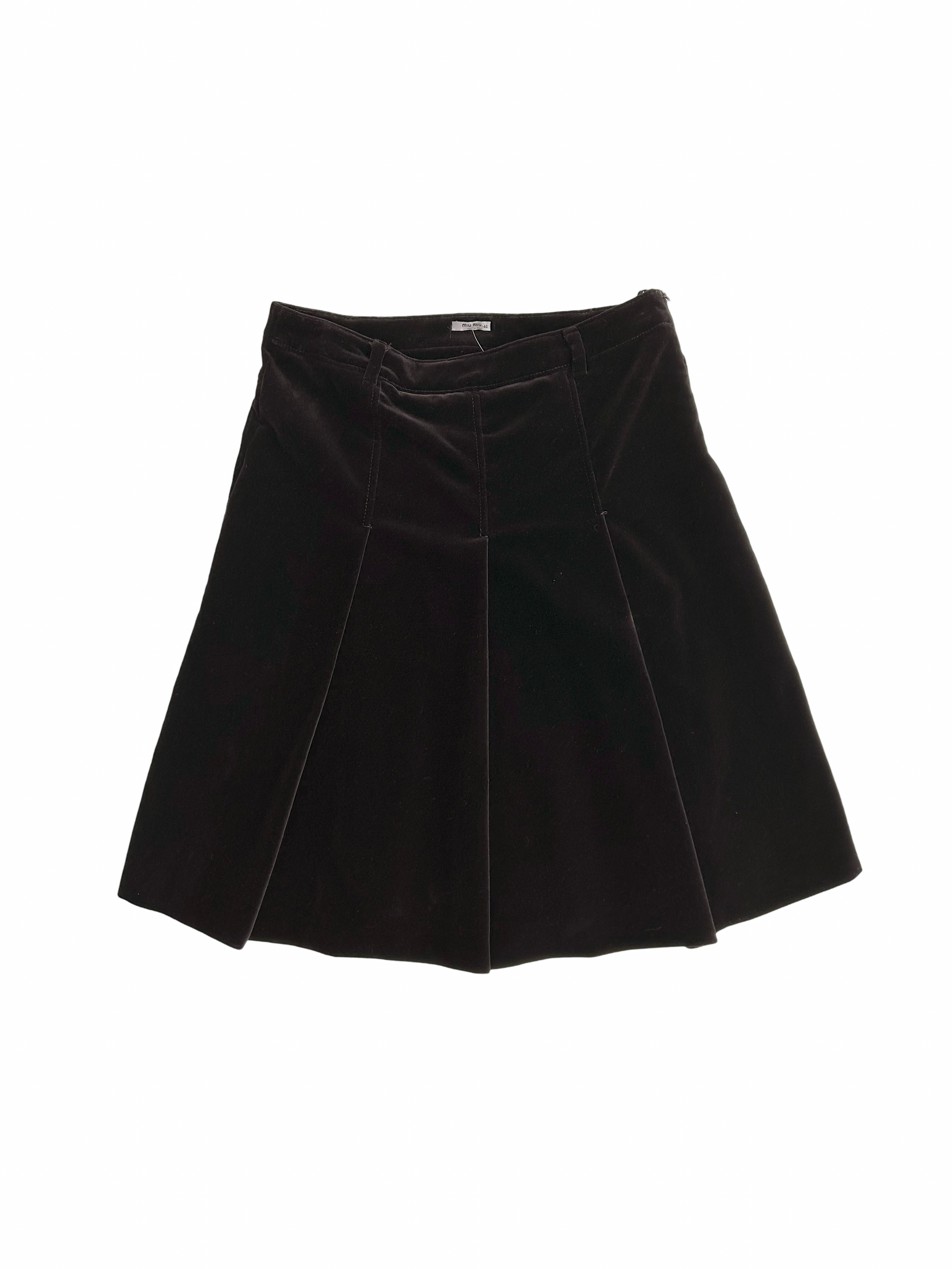 Gorgeous deep chestnut velvet skirt by Miu Miu. A a line skirt with pleated details and small pockets on the back, zips on hip.