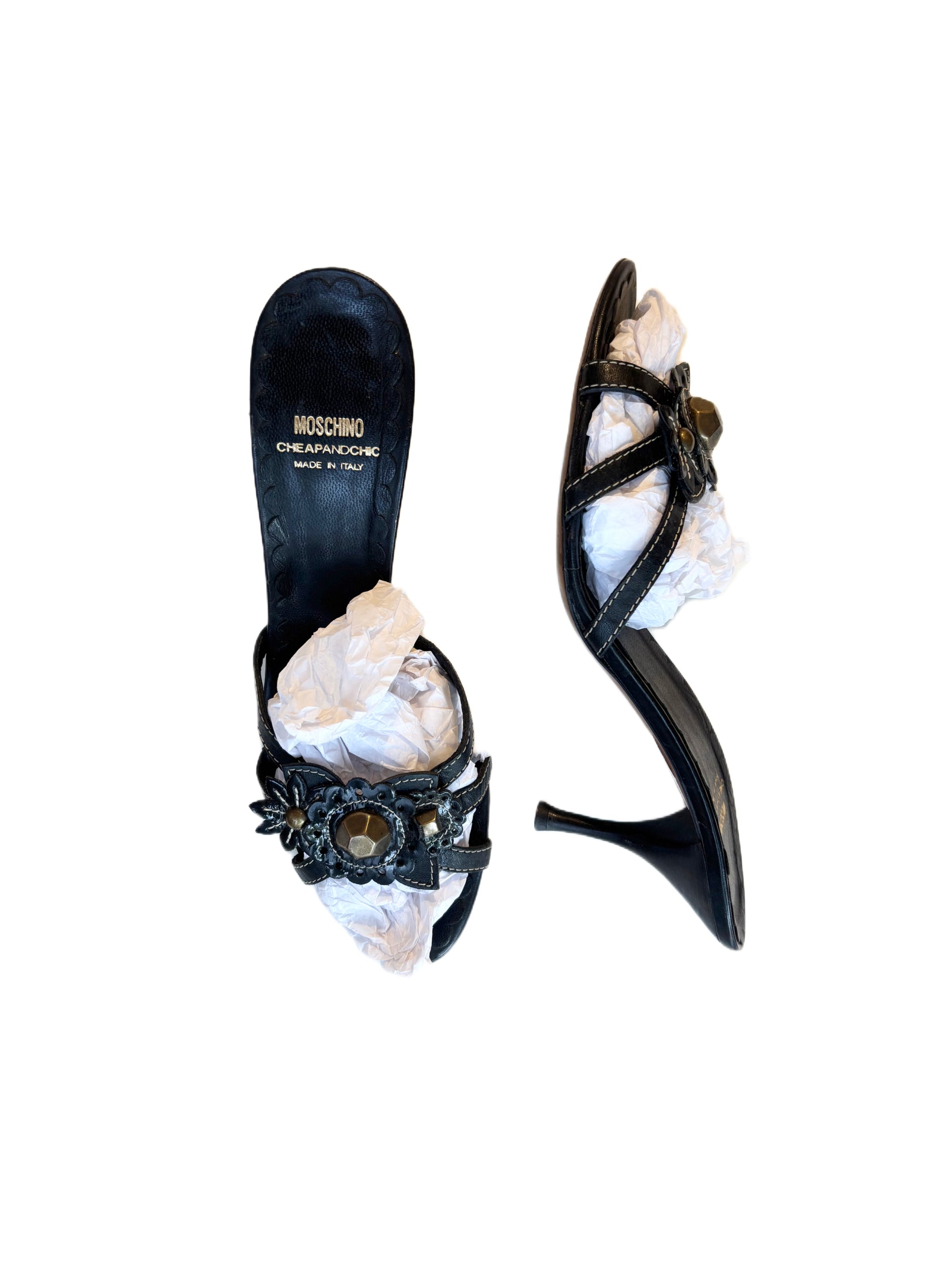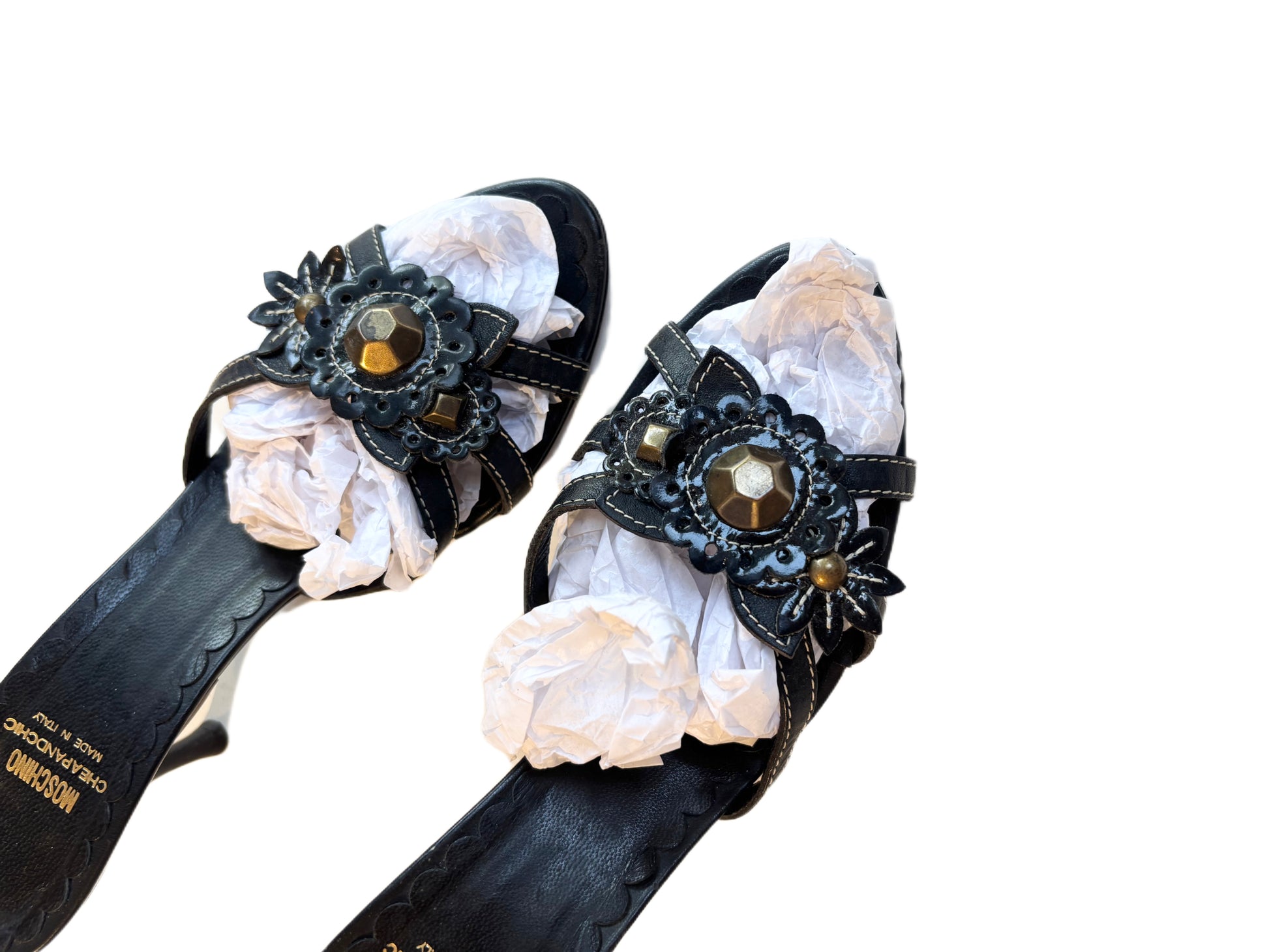 Moschino never shies away from drama, and these vintage heels prove it. Featuring black satin uppers and bold front embellishments, these open-toe mules are whimsical, feminine, and striking. Perfect for cocktail nights or gallery openings, they capture the essence of Moschino Couture: playful luxury with attitude.