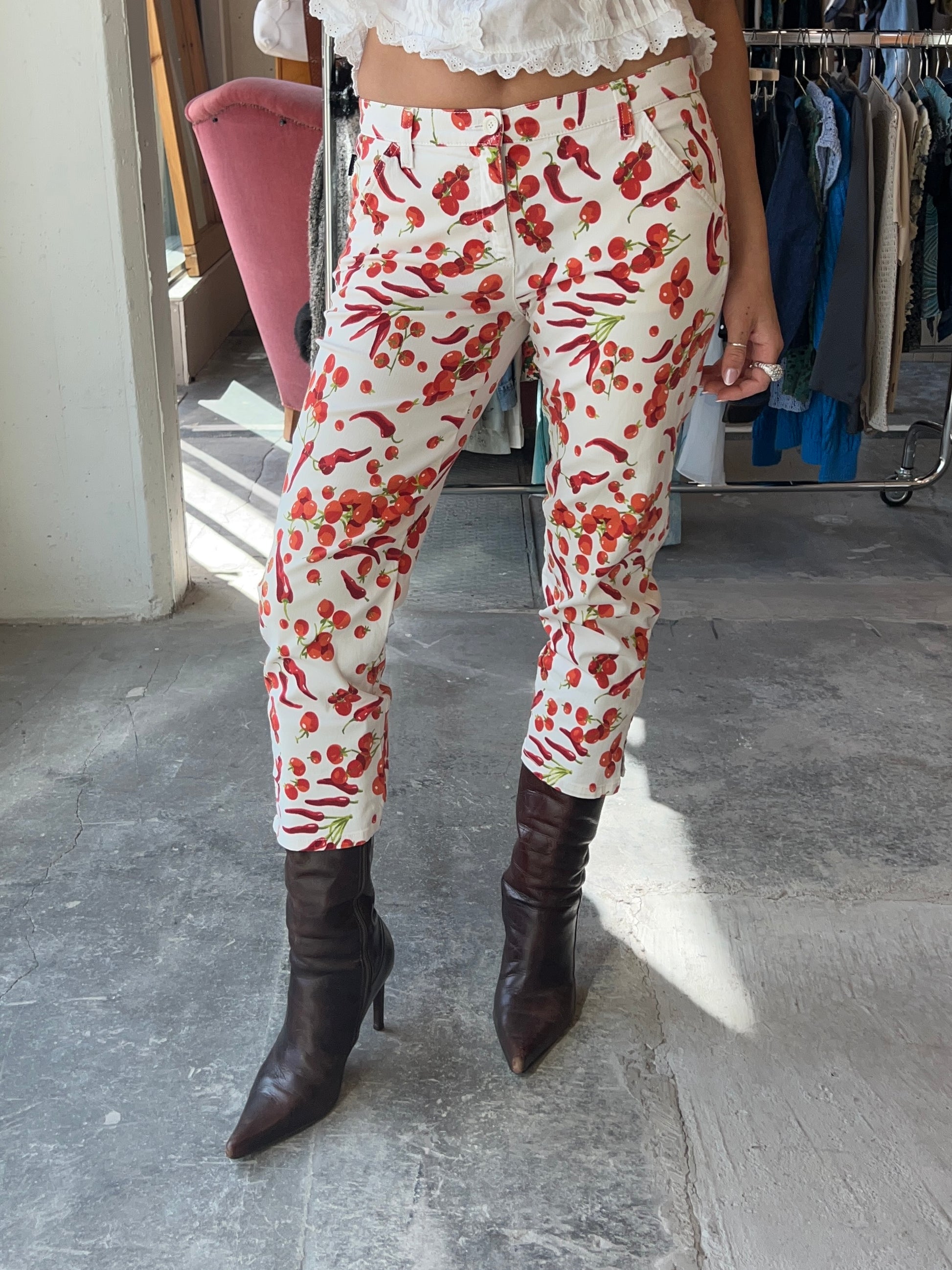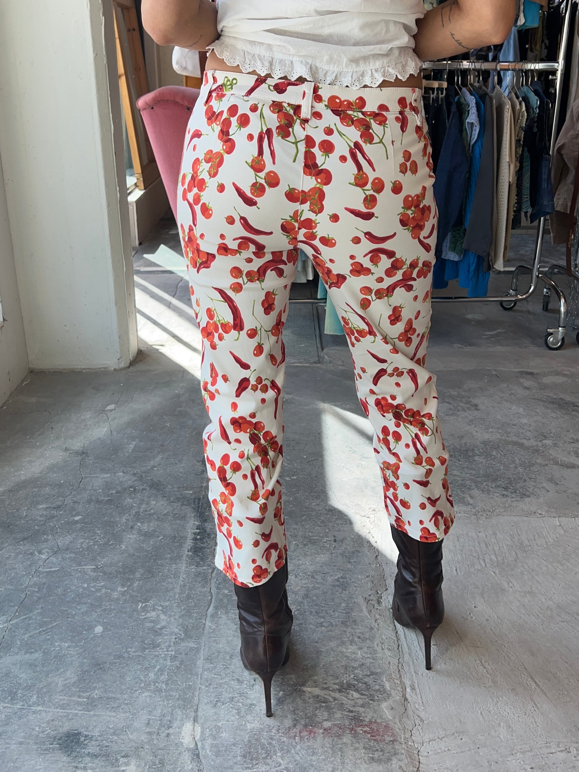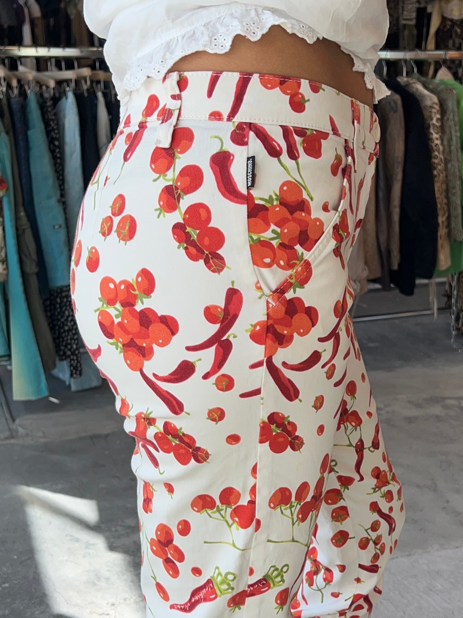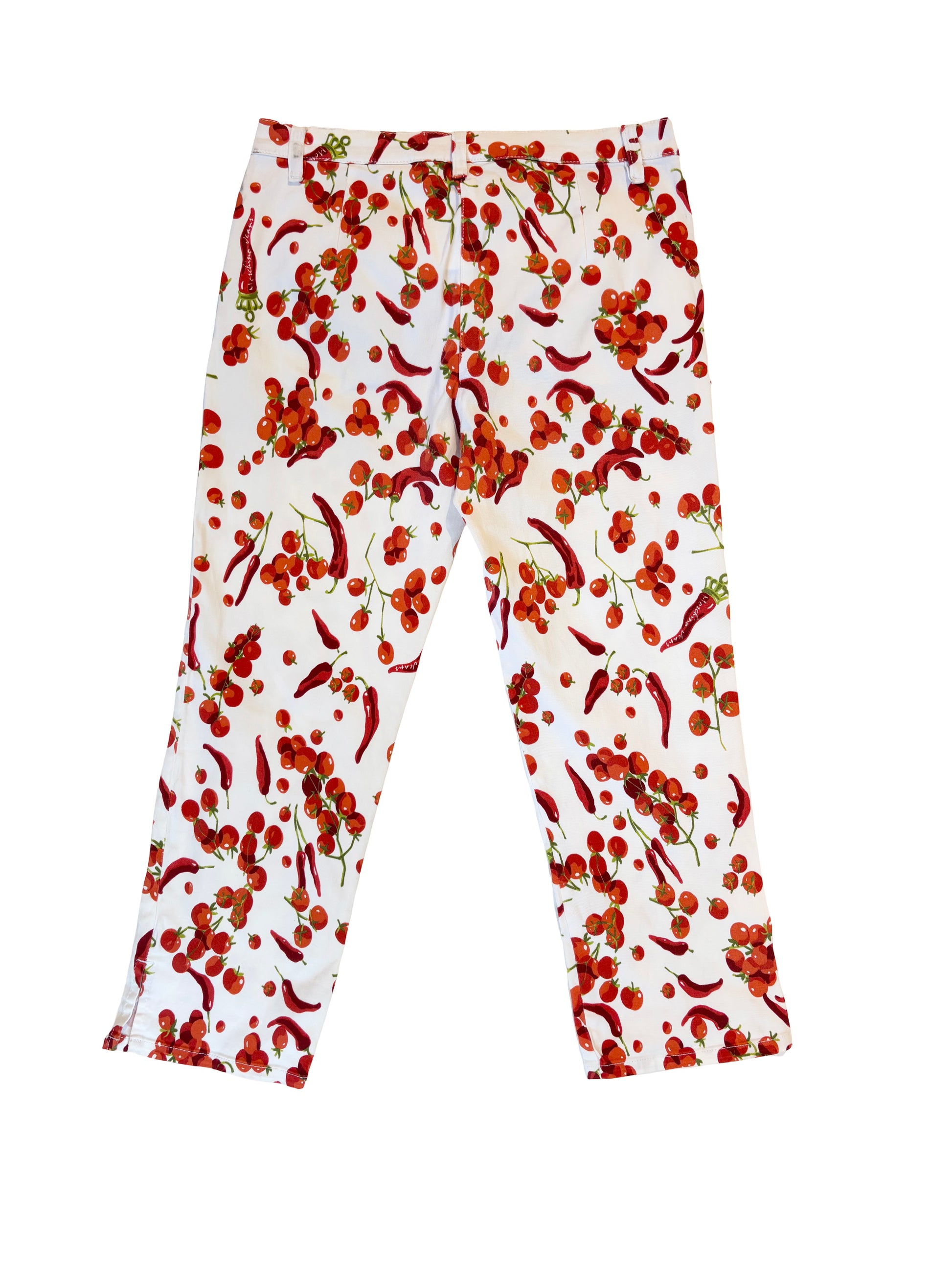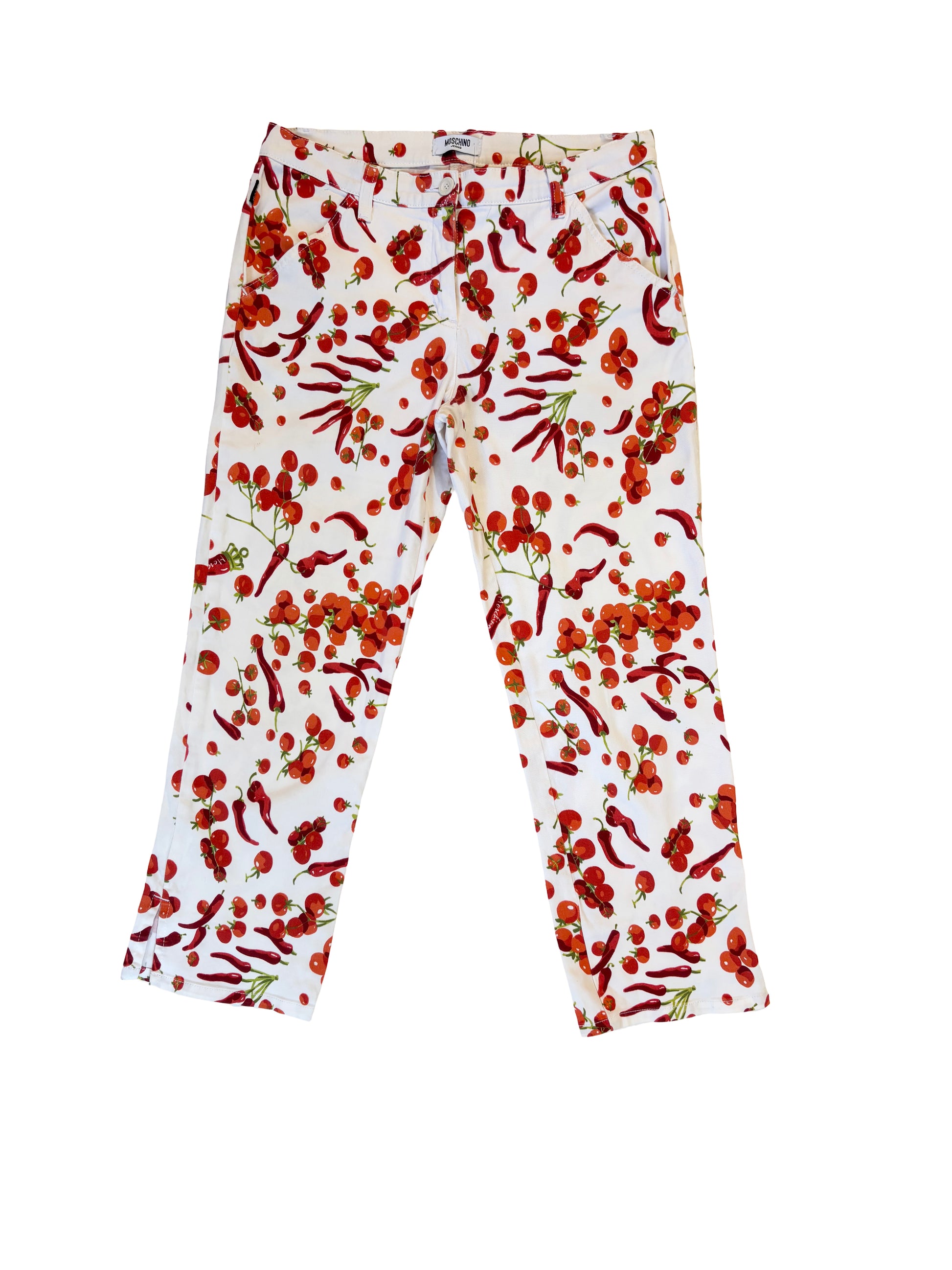 Playful and bold, these vintage Moschino Jeans capri trousers are a celebration of joy and movement. With their vibrant red tomato and chili print on crisp white, they radiate energy and a sense of fun.