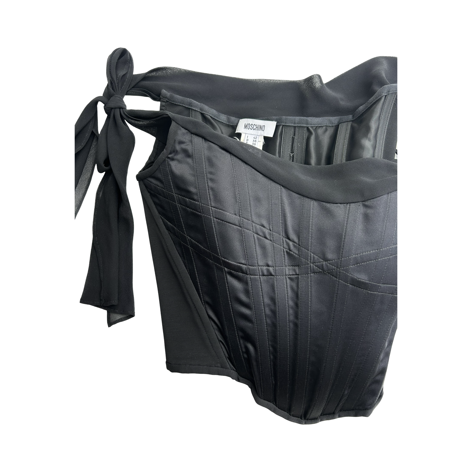 A romantic corset with beautiful detailed seams, a drop shoulder with ties and zipper in the back.