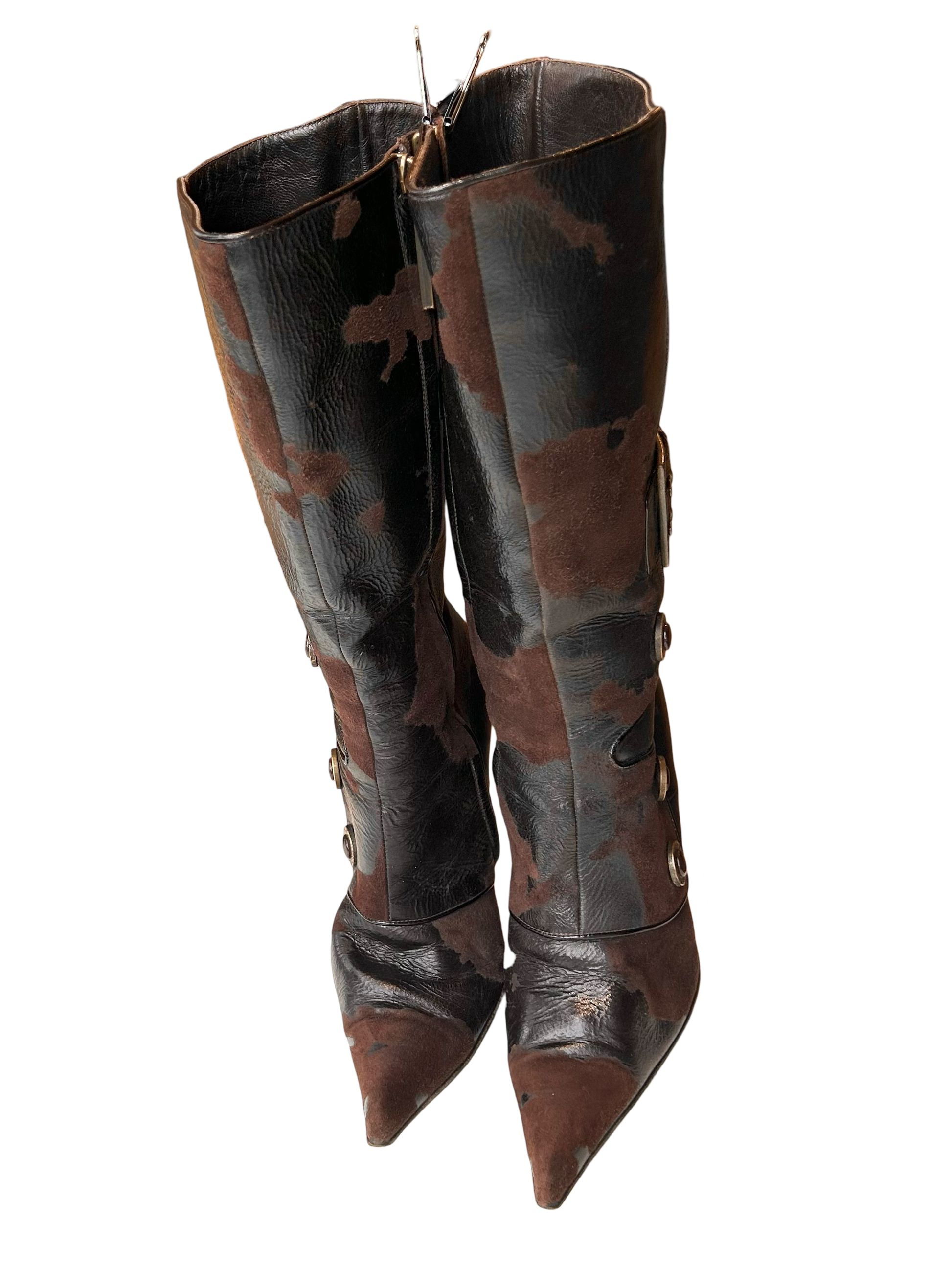 A rare pair of pointy boots in shiny leather and cow mix, brass colored button details and big buckle on side. The heel has a bamboo/ branch design which gives them that extra touch. Calf high with zippers on the inside of leg.