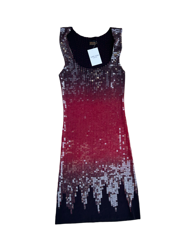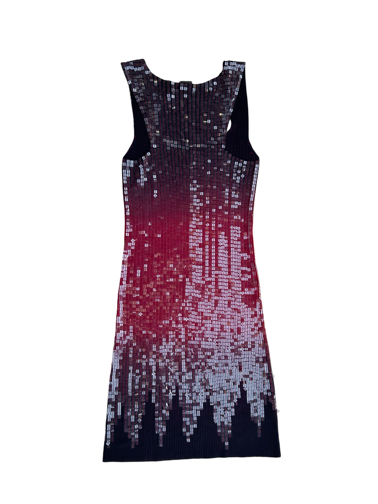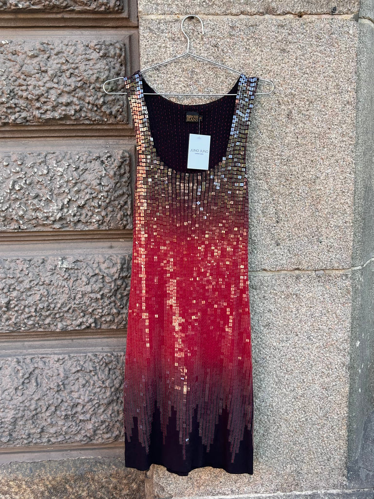 A mid length dress in a stretchy knitted fabric with sequins in dark red ombré color.