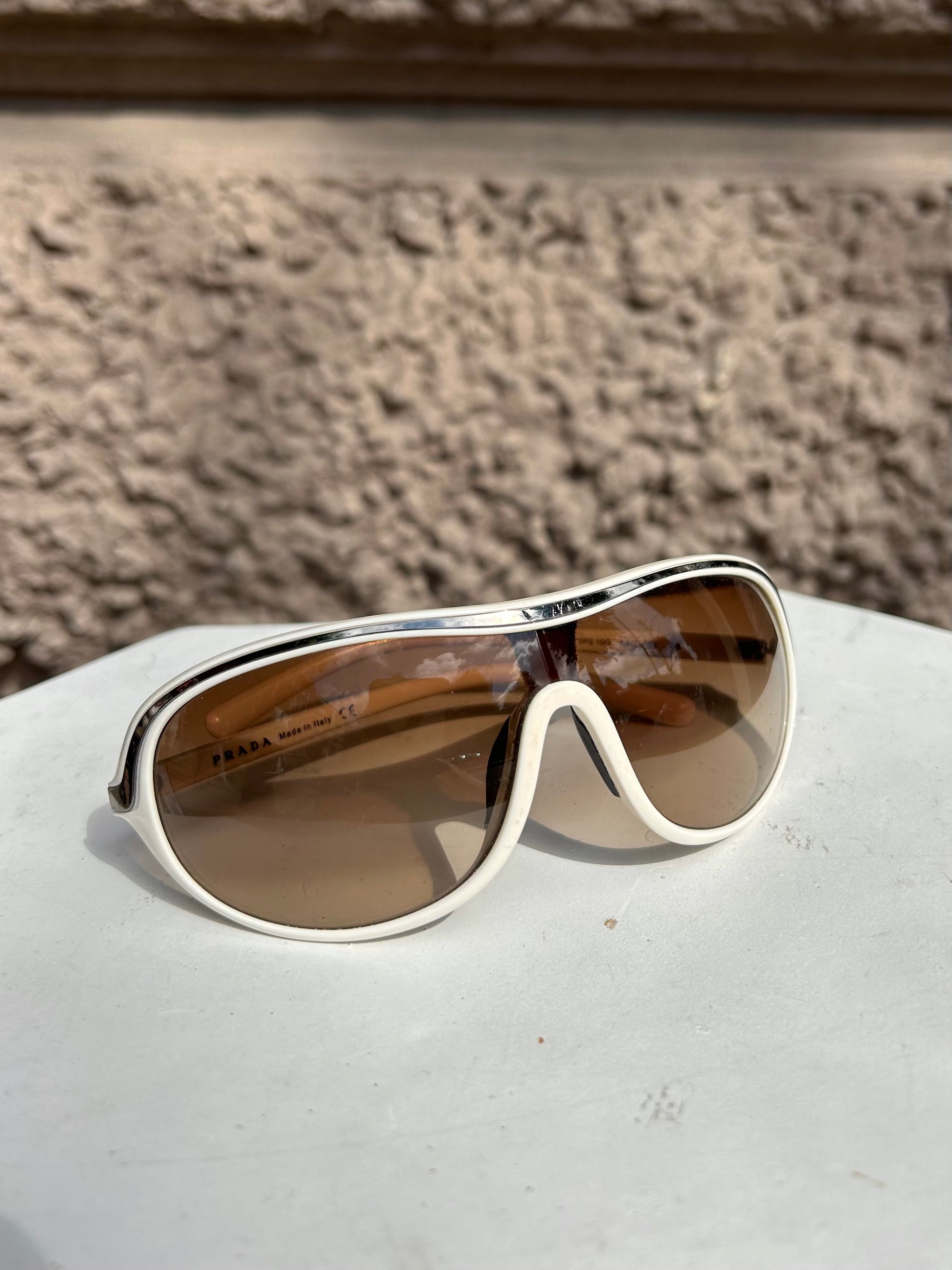 Big and bold in a mix of white and brown with logo in hot red by Prada. Original case some with