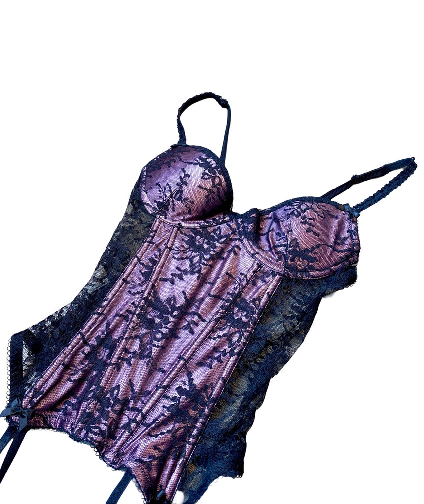 Sexy lace corset with shiny purple lining. Padded cups and size adjustable hooks in the back. Cute and kinky!