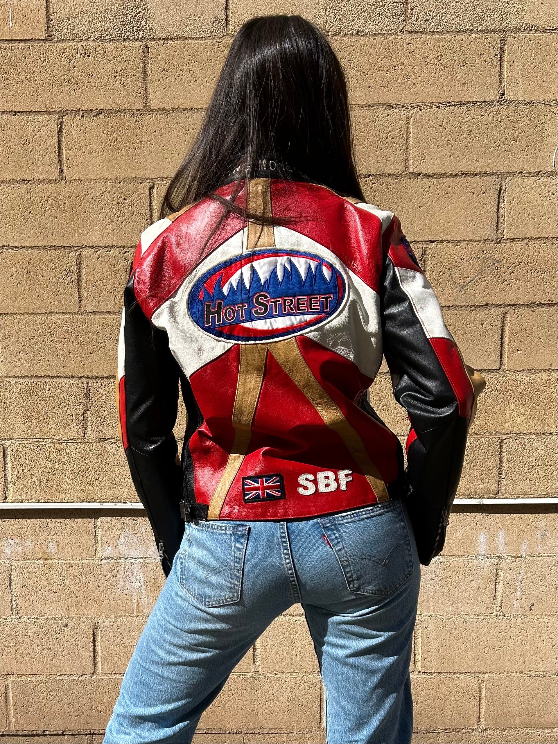 The perfect moto biker jacket in a mix of white, black red and some electric blue in the back. Designed in full racer vibe in a classic biker fit. Slightly lined and with with discrete zippers in front and on sleeves.