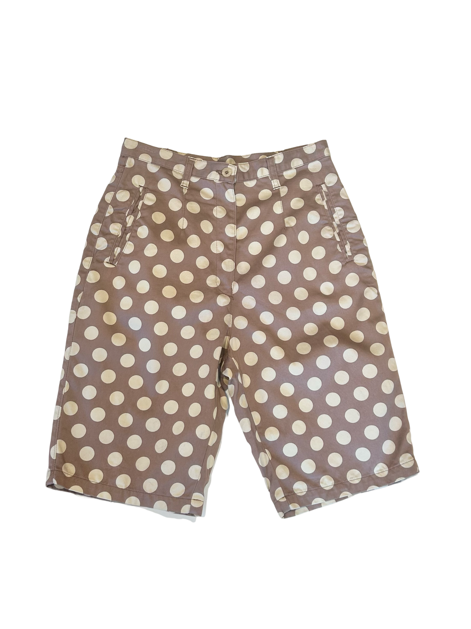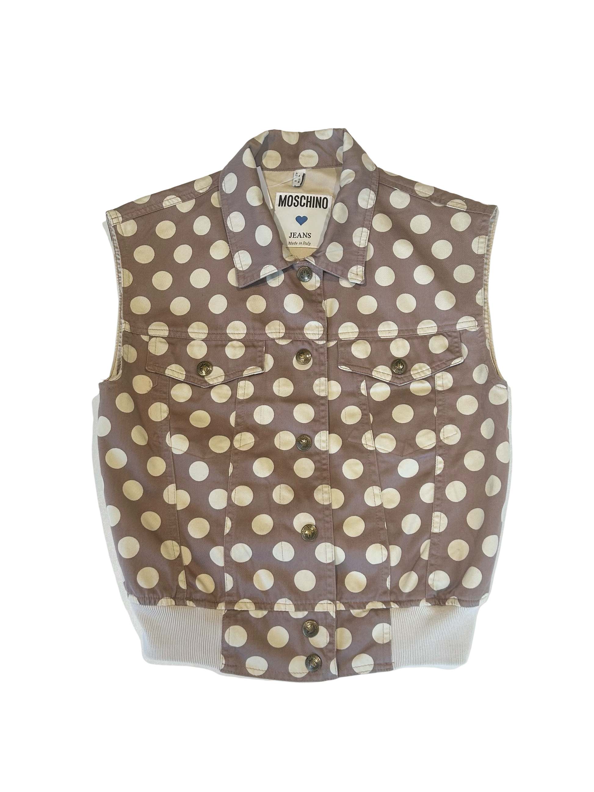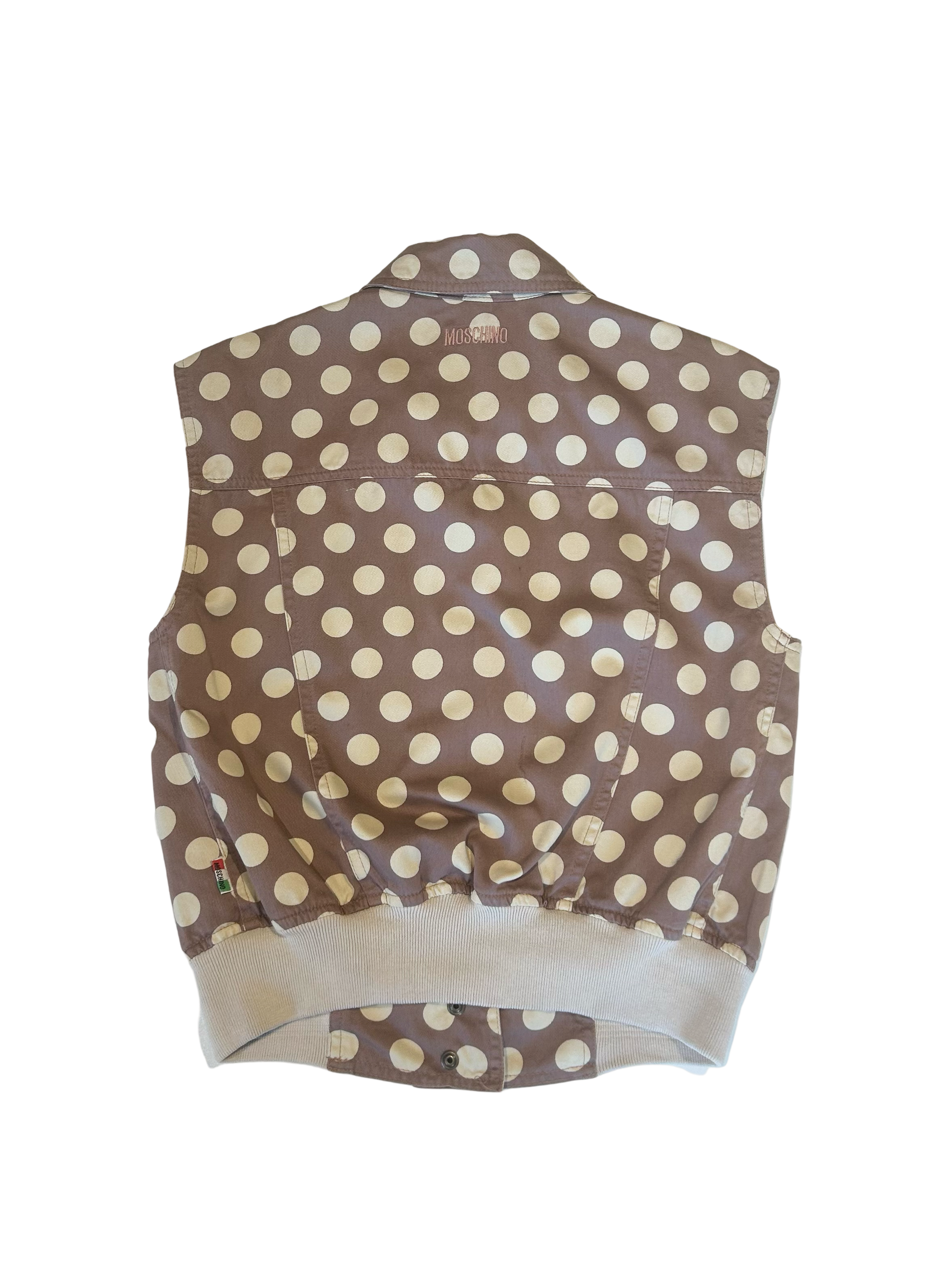 A rare and unique set of vest and Bermuda shorts by Moschino. No sleeve vest with buttons in front and shorts on a mid length. Cream white polka dots on a rust pink backdrop.
