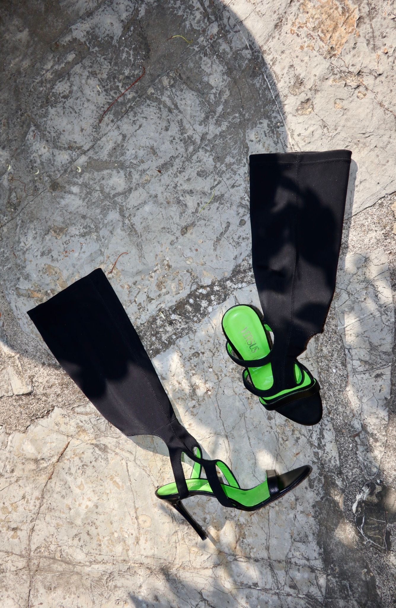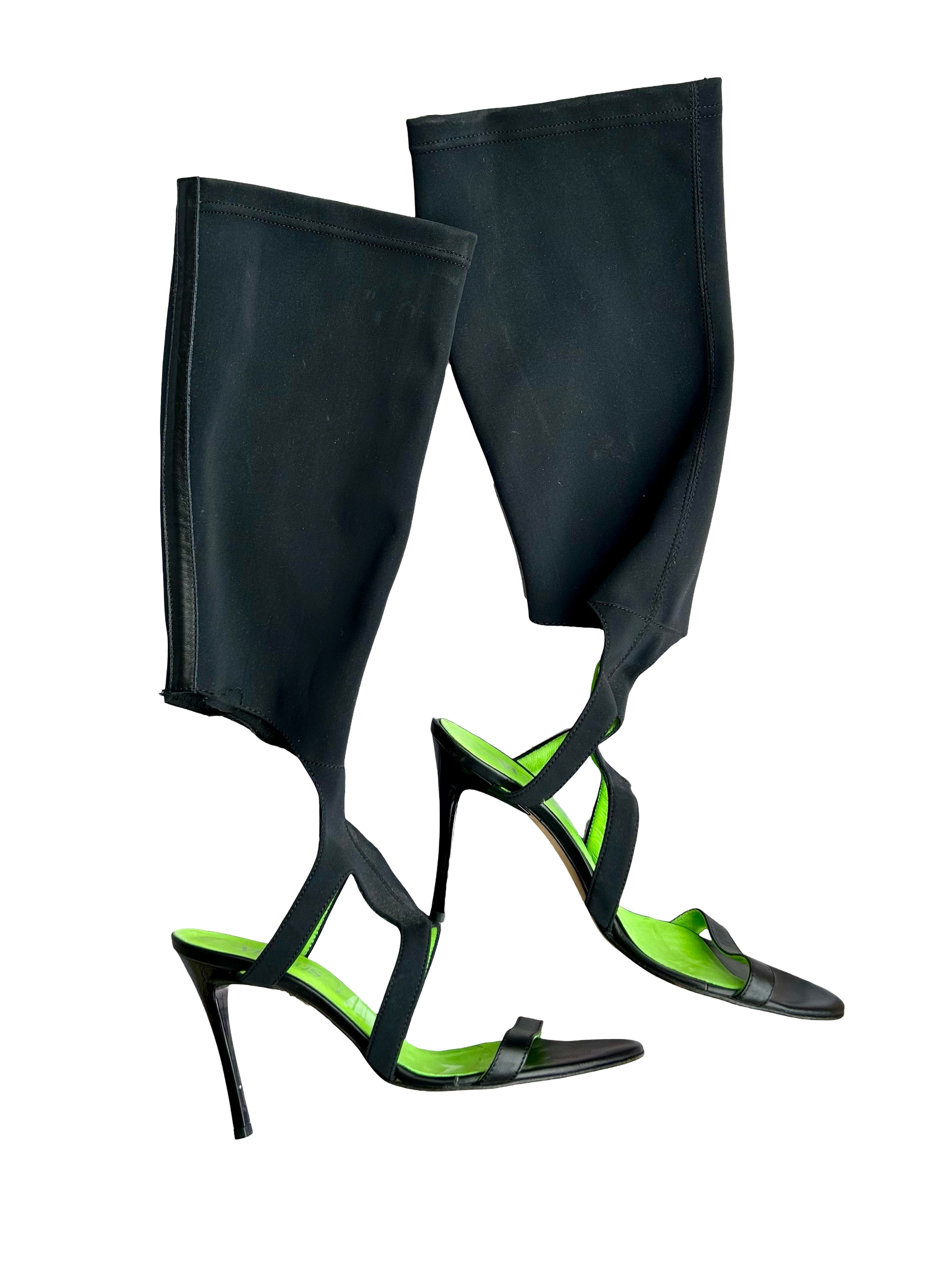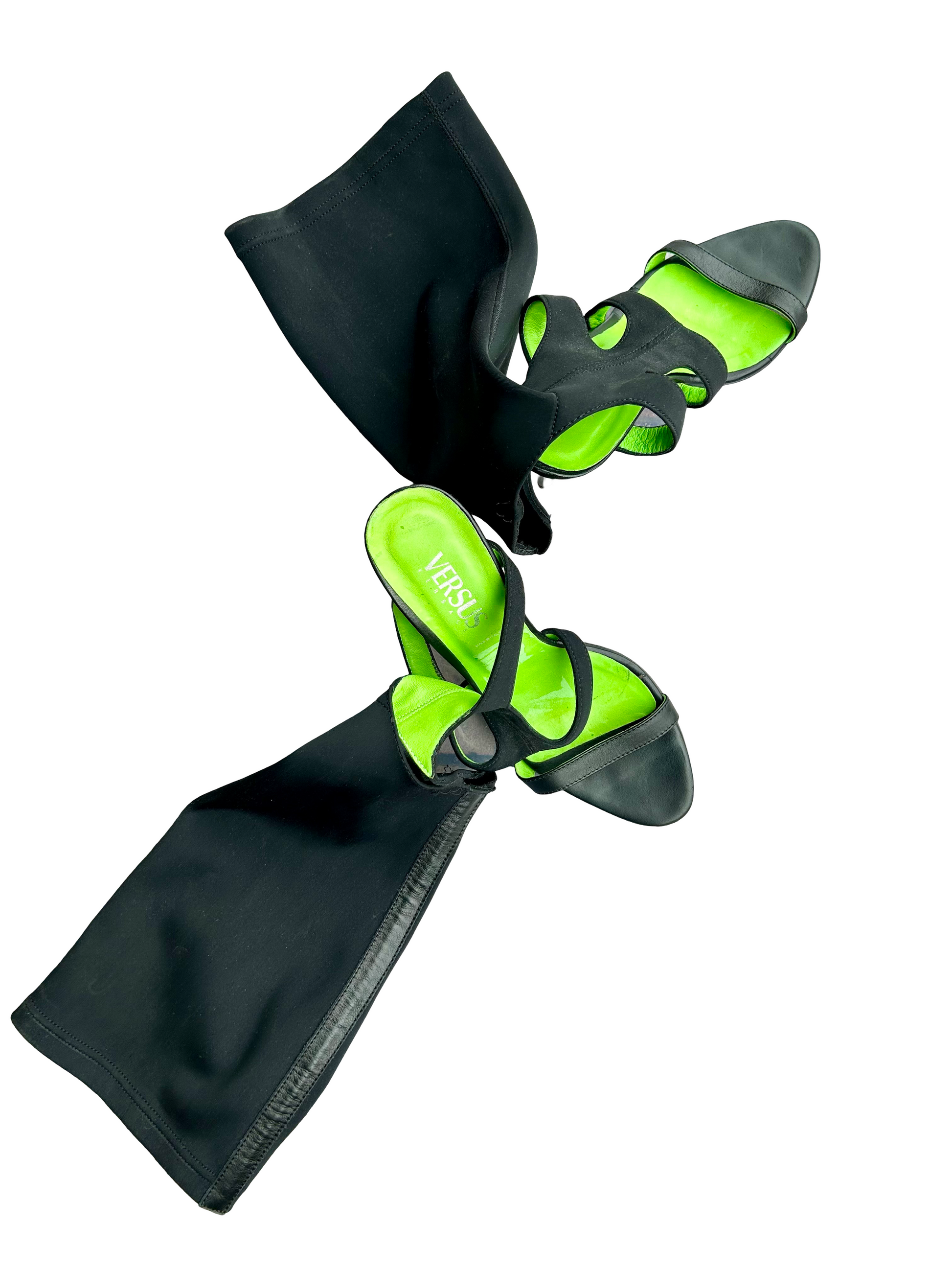 2000’s Versace black stiletto heels with neon green inside and soles. These rare heels have a scuba material on the calf with leather detail in the back and a cut out effect to the front of the shoes. A high and fierce stiletto heel and steady strap design.