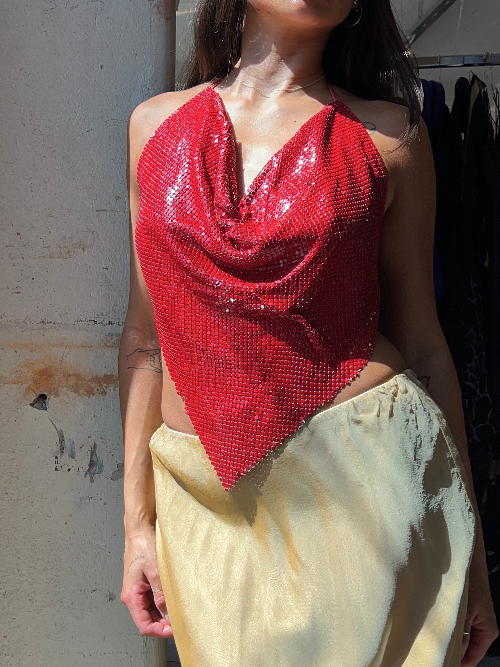 Funky bright red disco top! Soft lining with metal exterior that will move and sparkle as you dance!