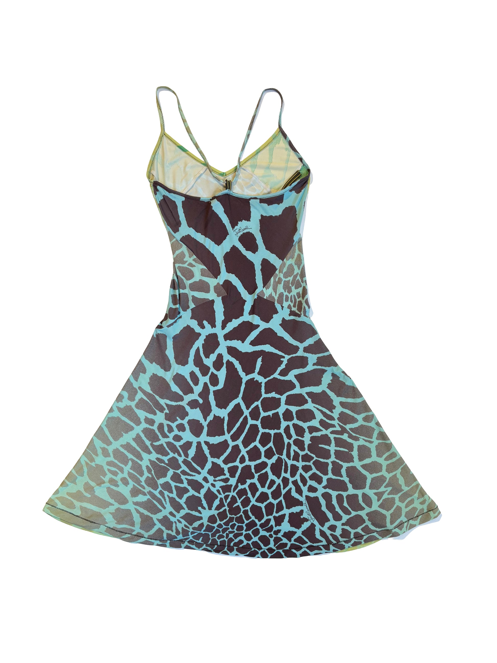 This stunning dress by Roberto Cavalli features a vibrant giraffe-inspired print in lush tones of green, turquoise, and deep earth brown. The fluid A-line silhouette glides effortlessly with each step, anchored by delicate spaghetti straps and a softly flared hem.