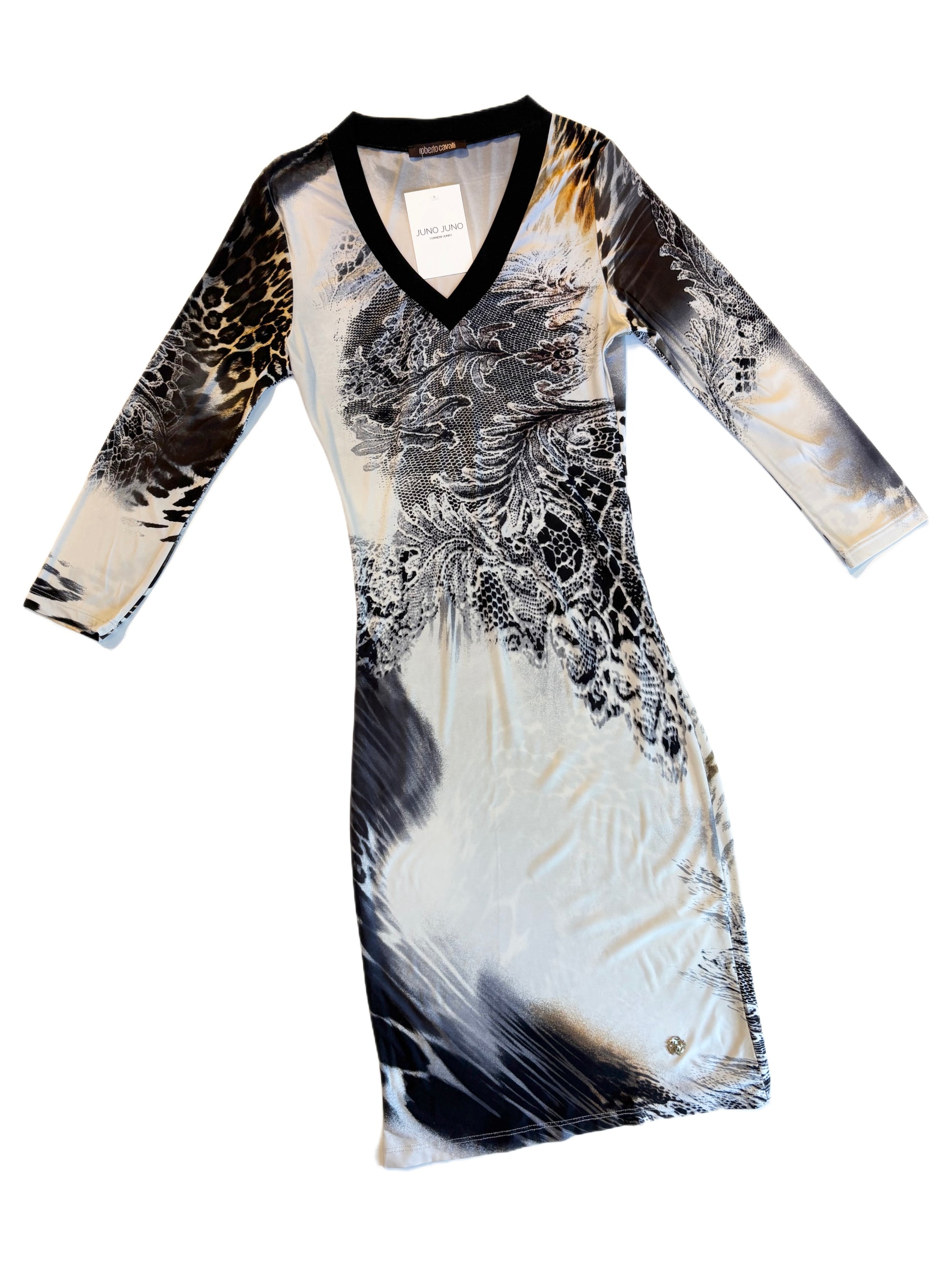 This Roberto Cavalli dress is a striking blend of elegance and wild energy. With its body-skimming silhouette, V-neckline, and bold monochrome graphic print featuring animal and abstract motifs, it’s a quintessential Cavalli statement piece. Perfect for evening wear or standout day looks.