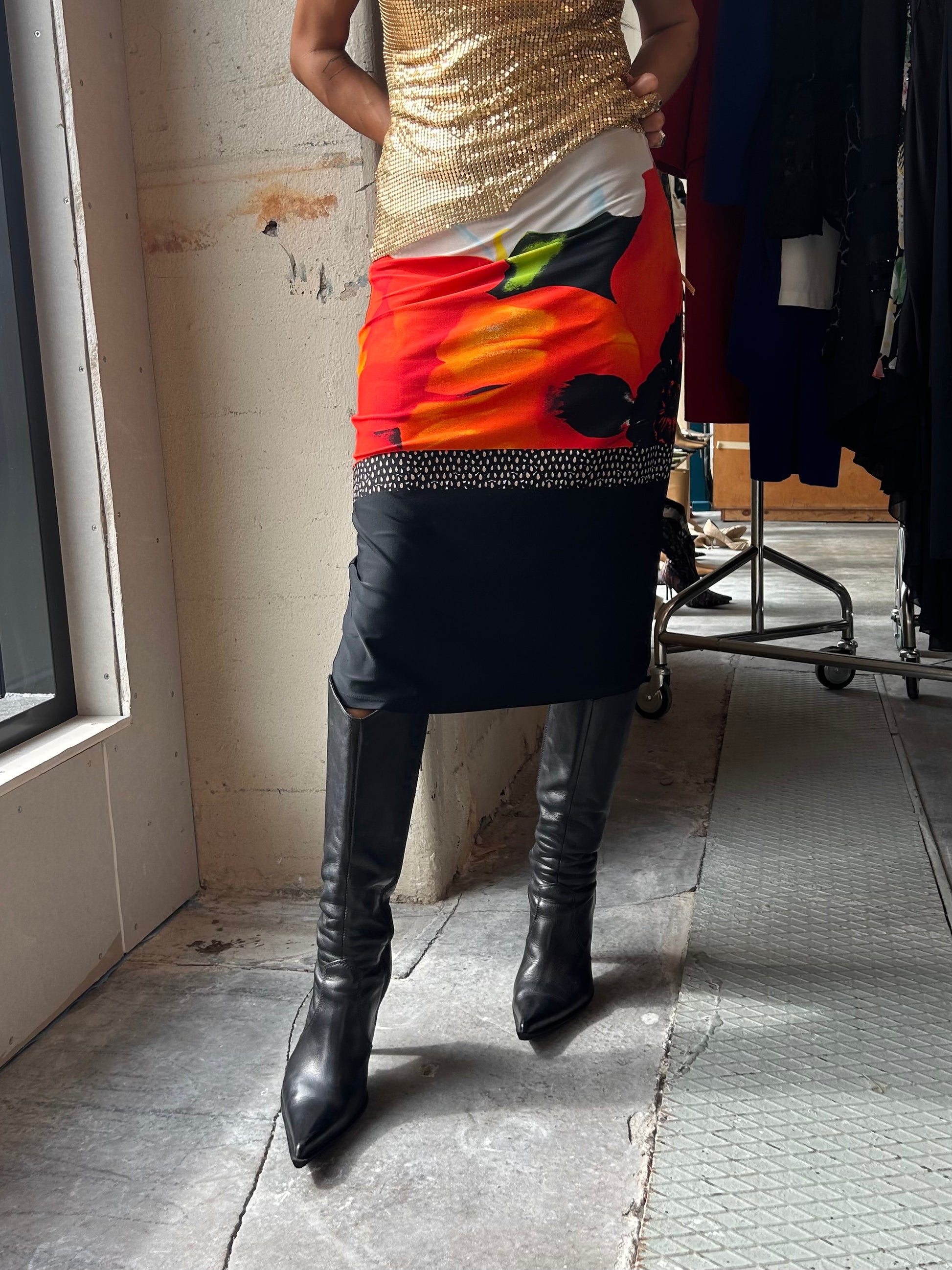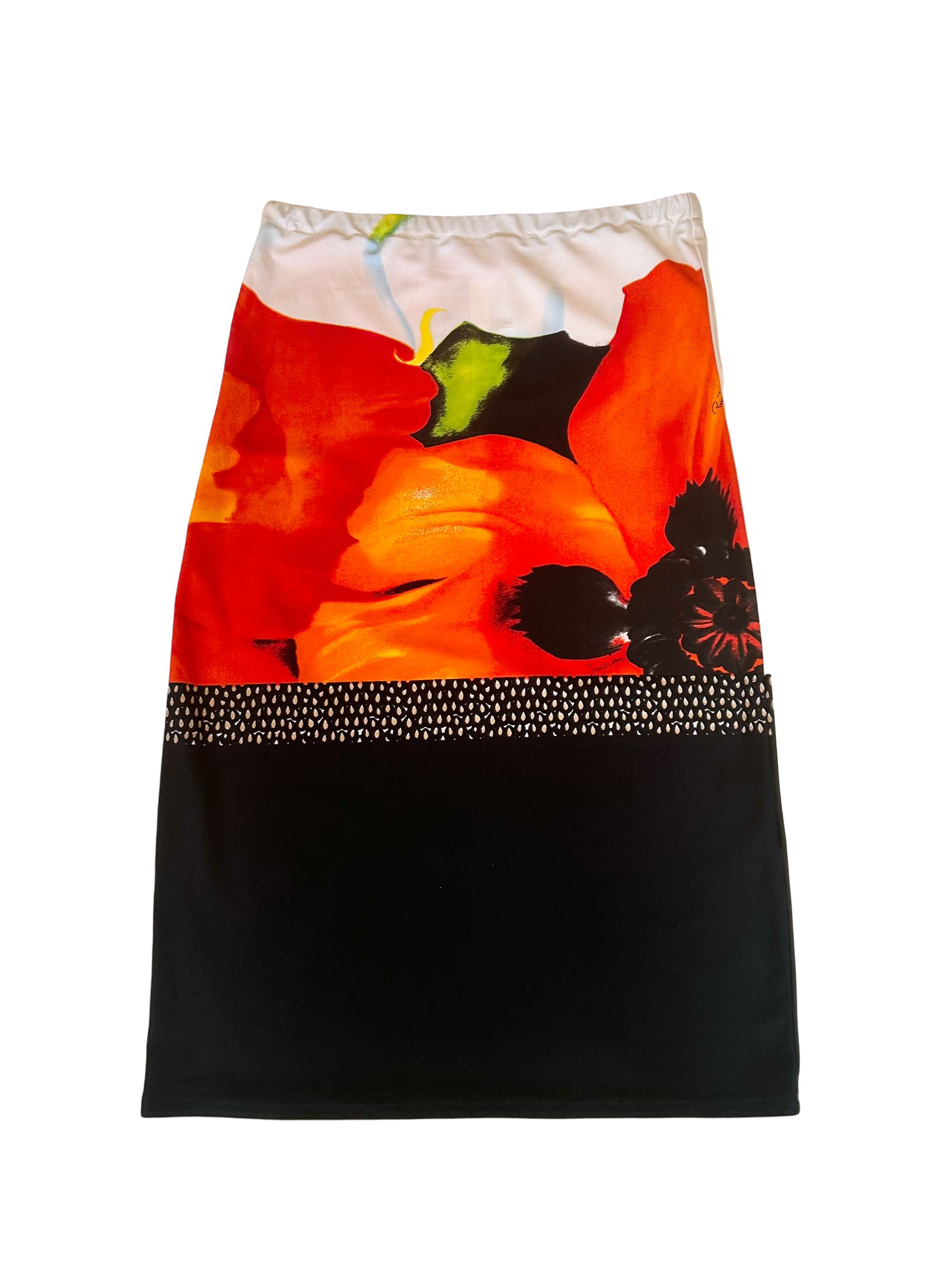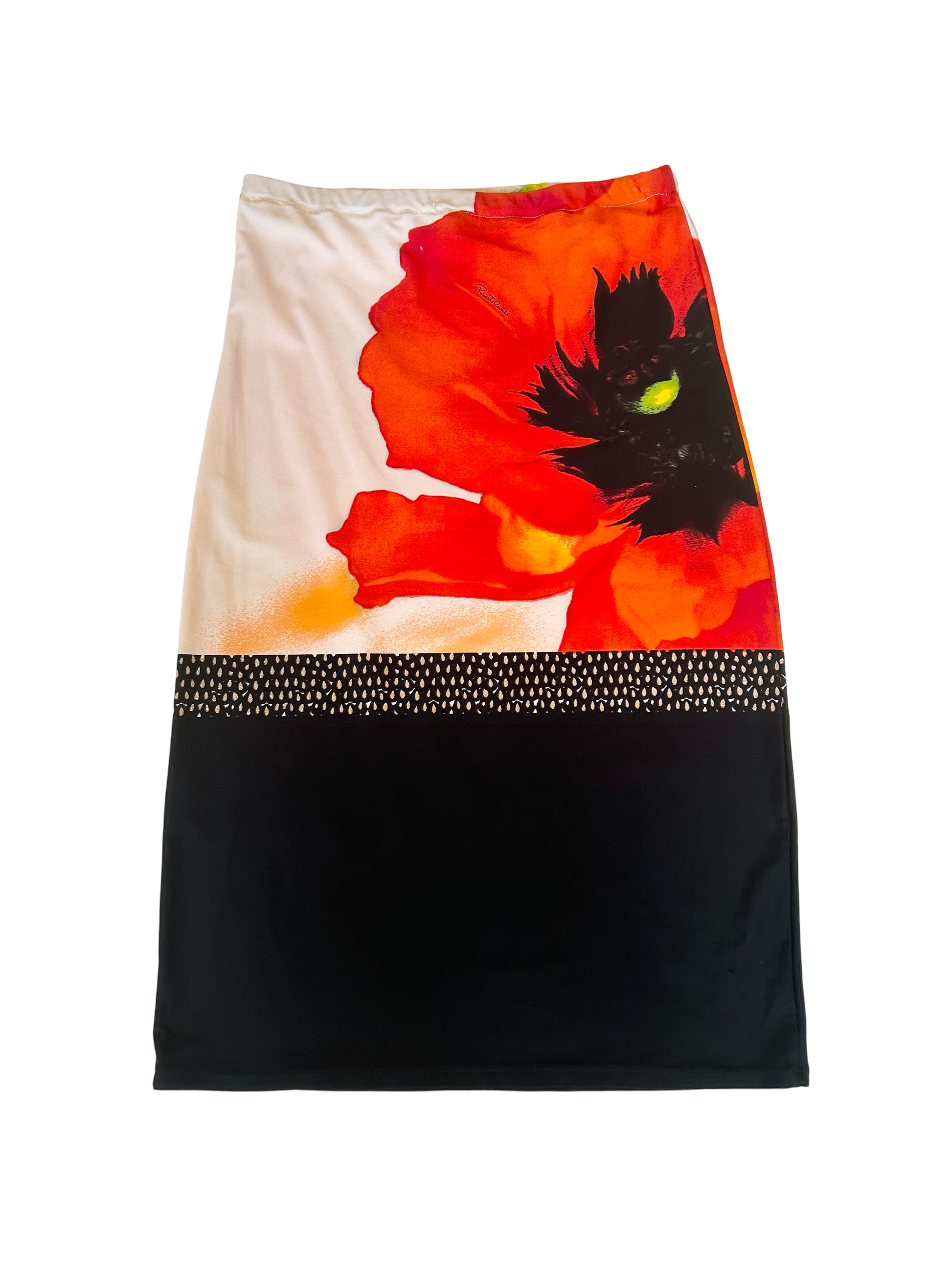 A slim fit and stretchy skirt with a beautiful pattern of poppy flowers with “Roberto Cavalli” signature in the print.