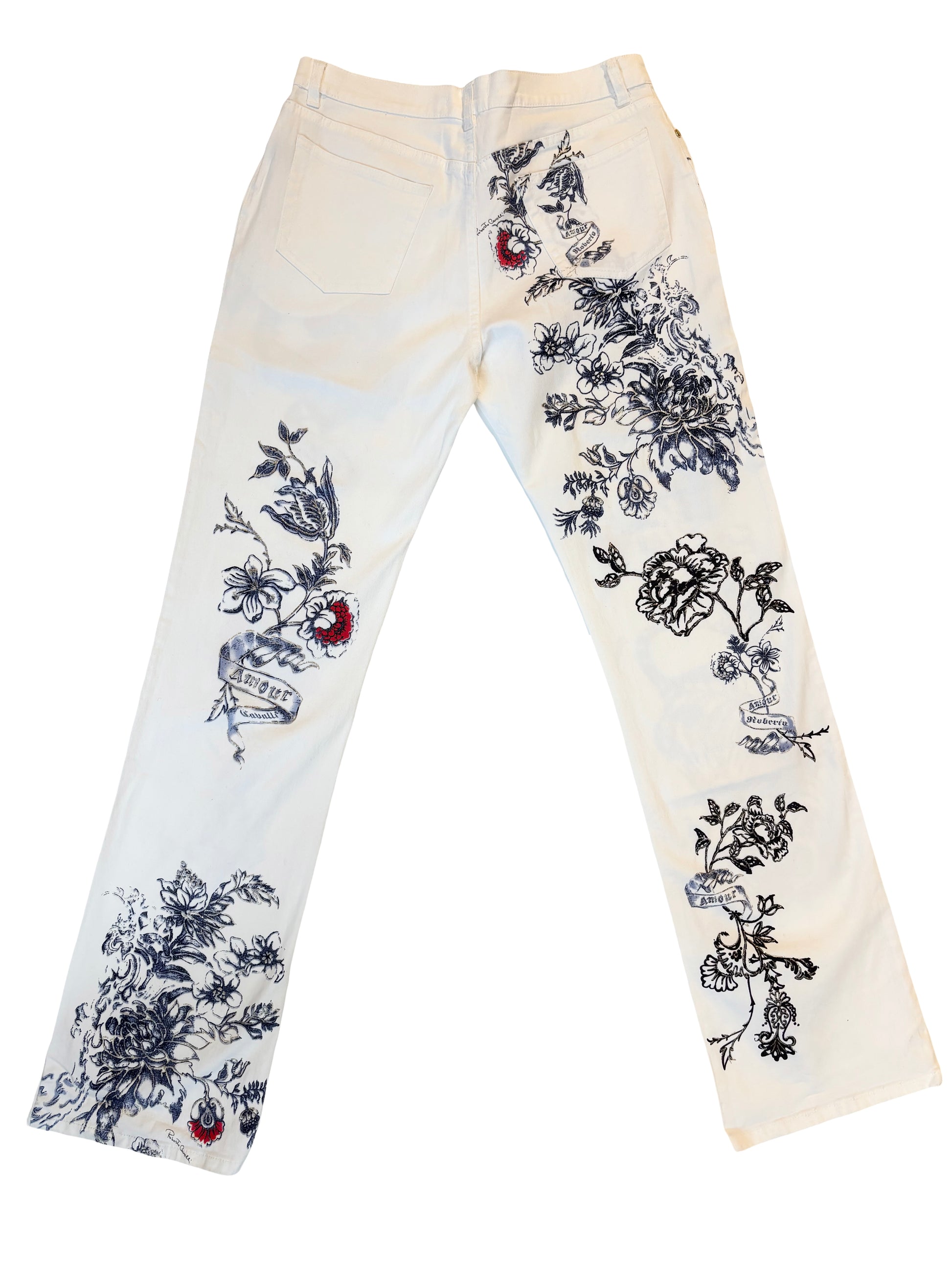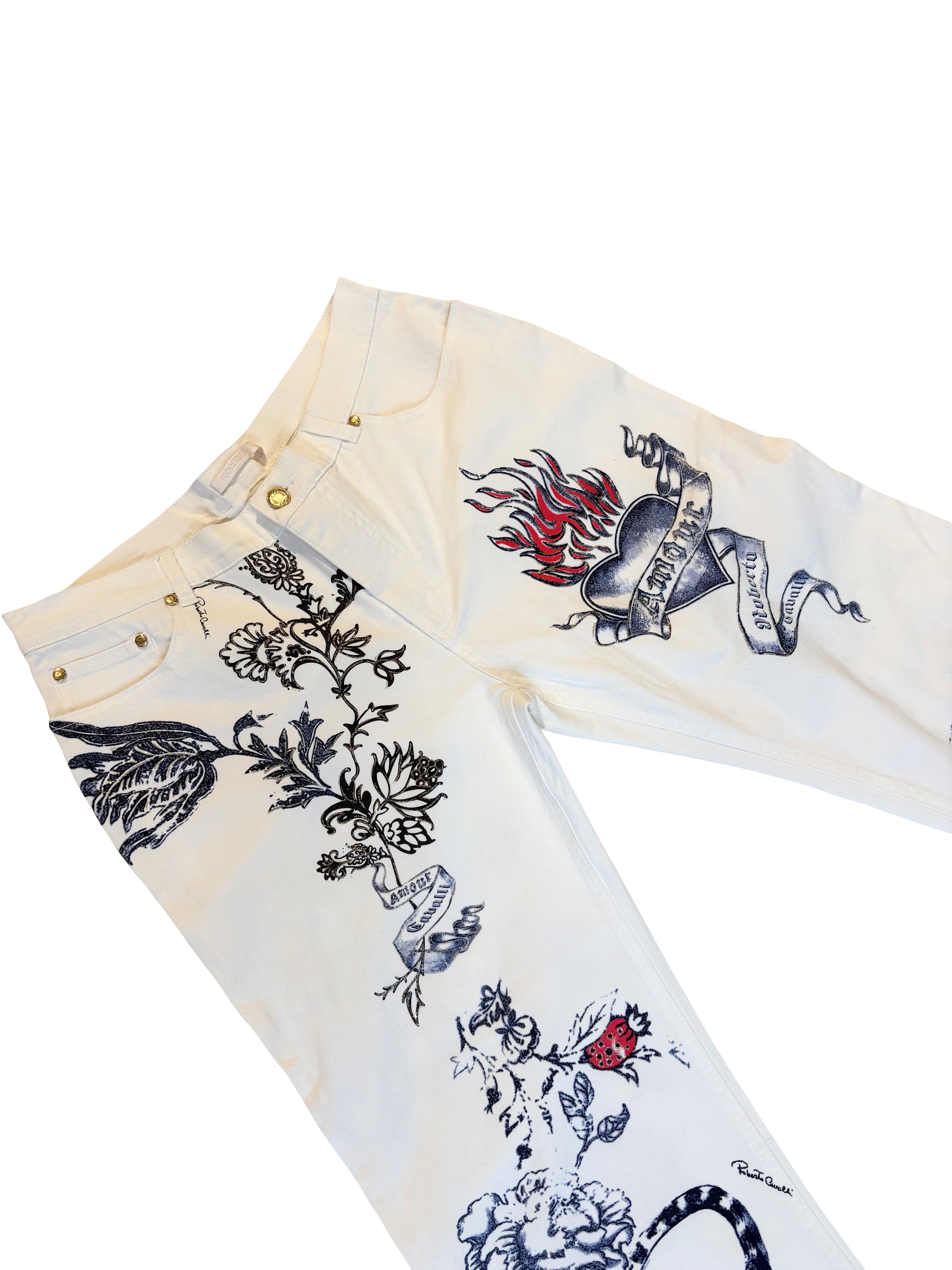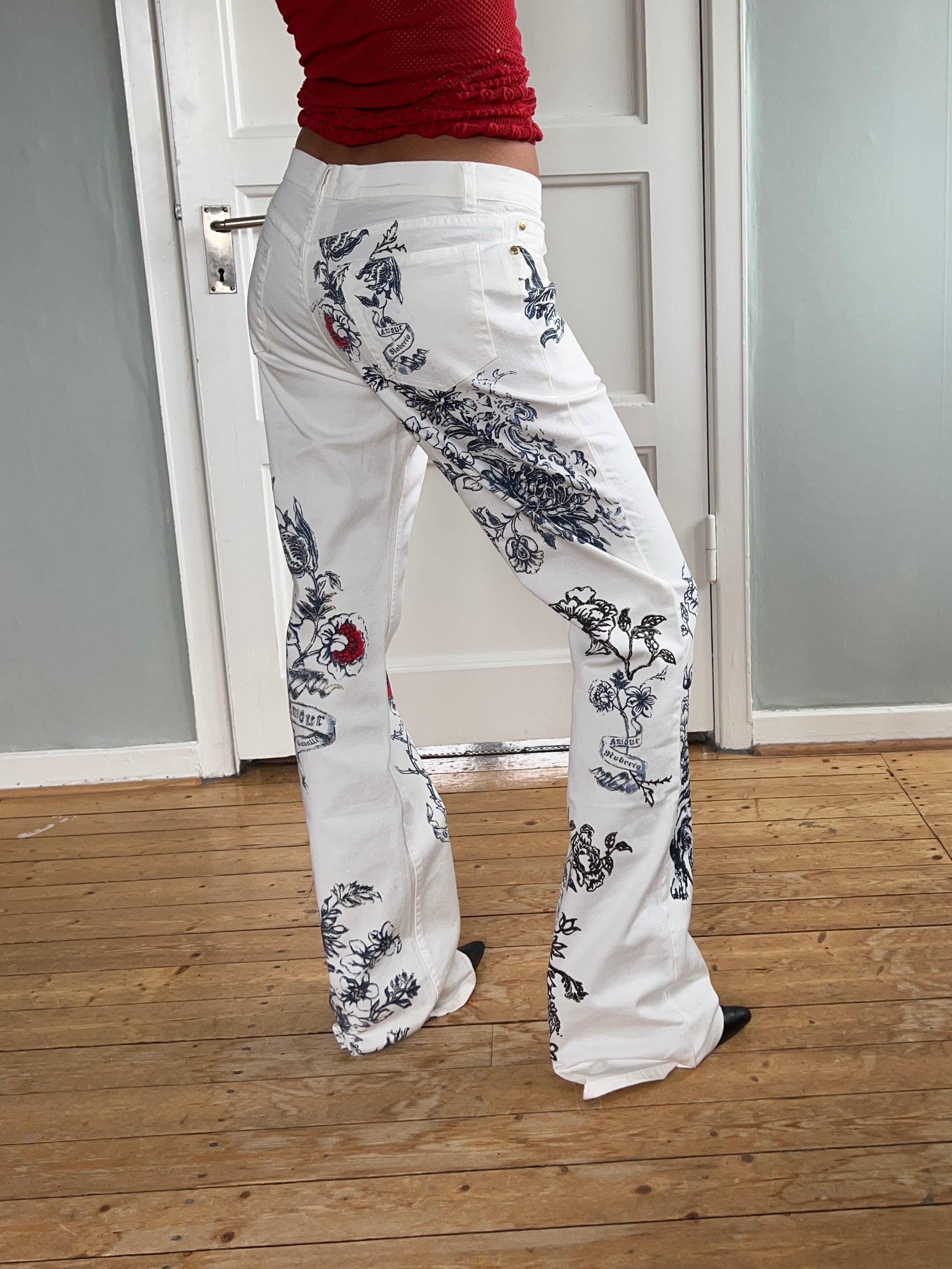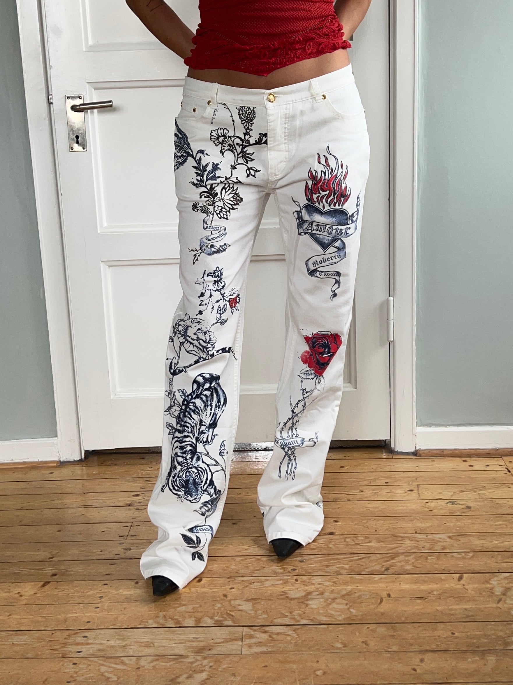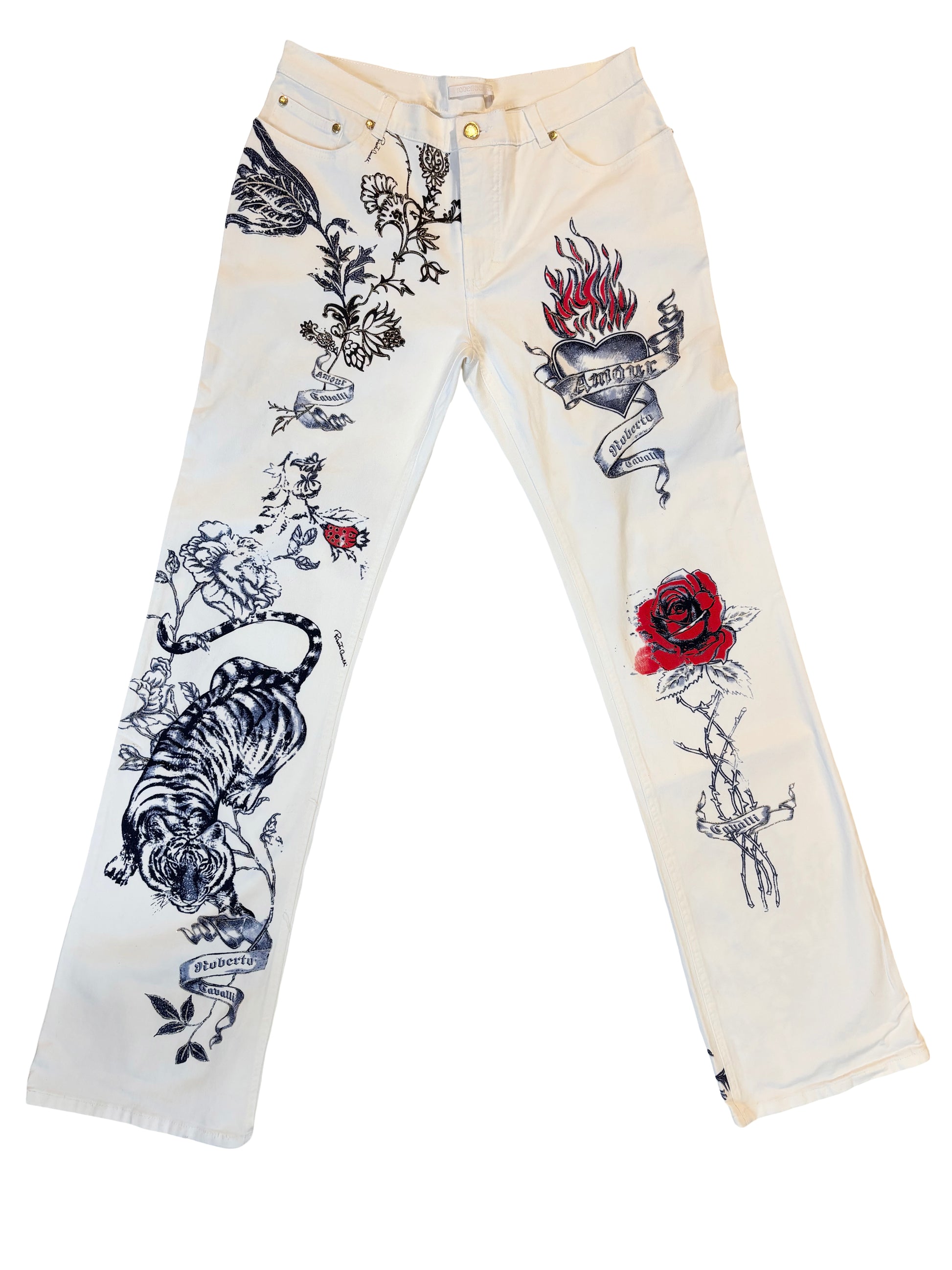 These Roberto Cavalli jeans bring boldness and artistry together in a true collector’s piece. Decorated with intricate tattoo-inspired prints including dragons, roses, and flames, these cream colored jeans celebrate Cavalli’s maximalist vision.