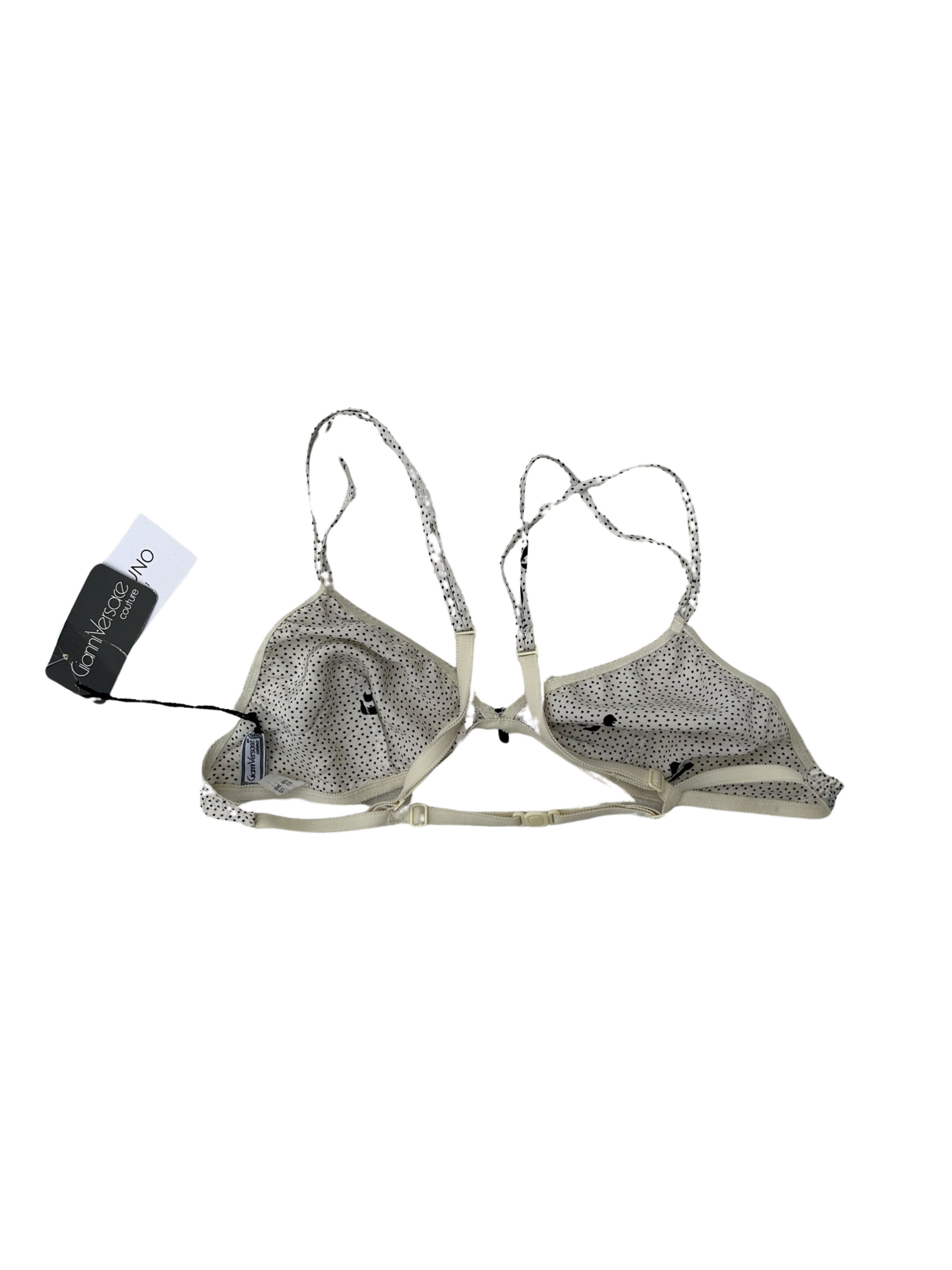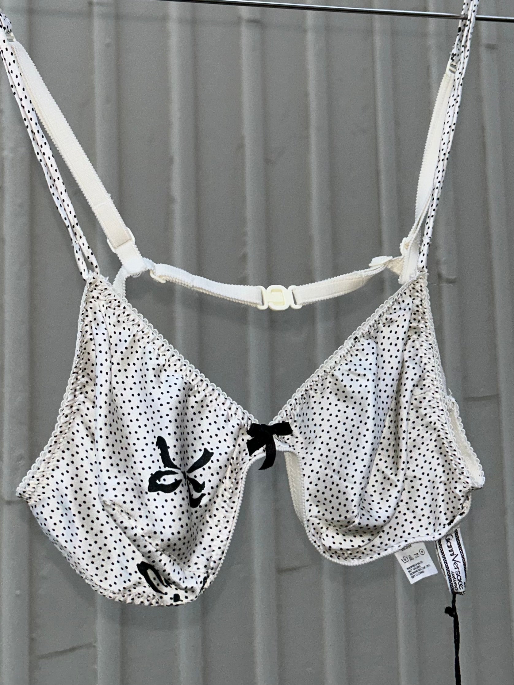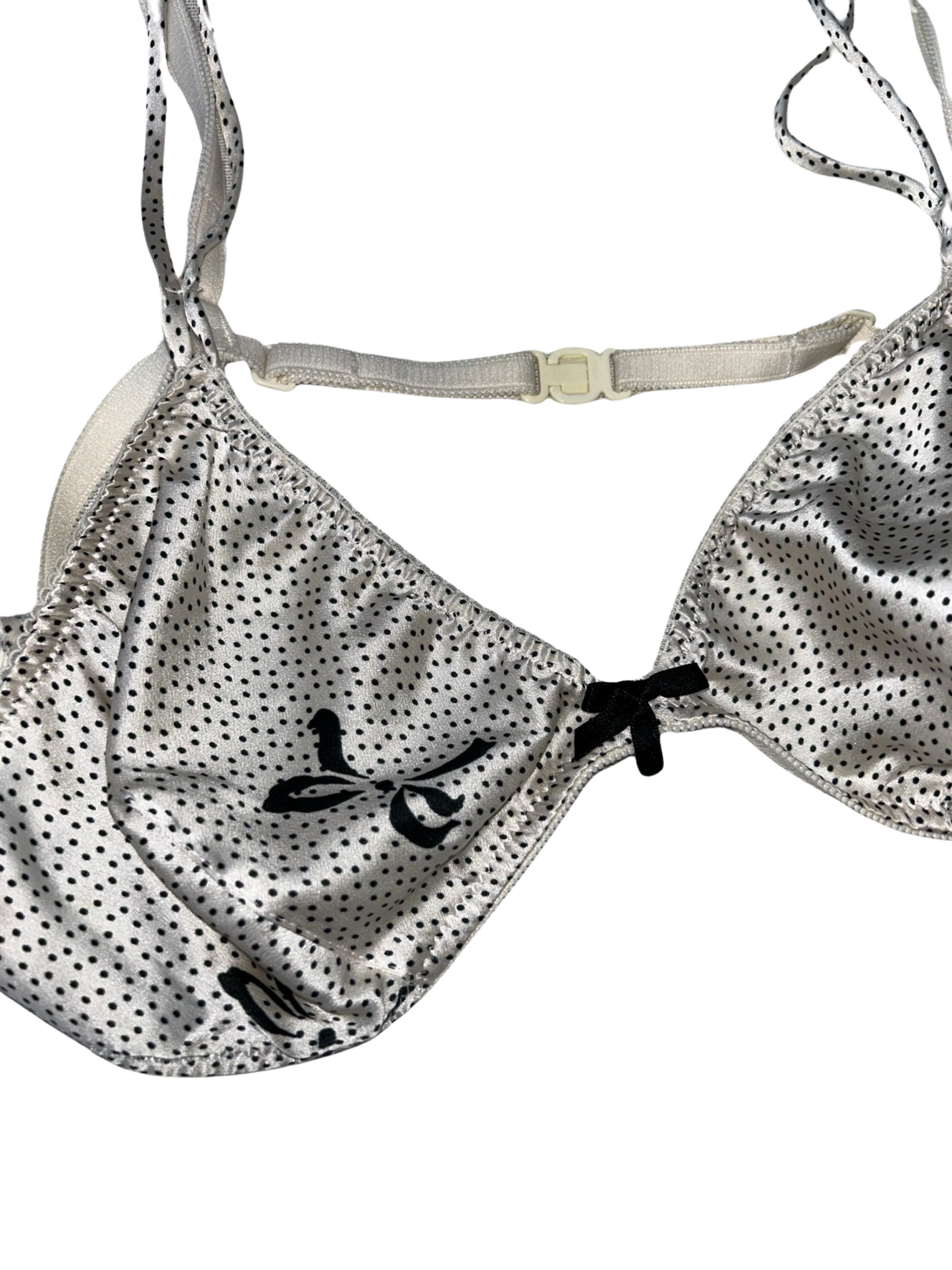 This beautiful silk bra is the perfect statement top to any skirt or pant for summer, or layer it with a mesh top on top, or why not just feel the luxury of silk on your skin as a bra. This effortless luxury garment is a perfect edition to your staple wardrobe, a pearl white silk material with black dots, cutest bows on the print and in the middle of the chest. The slim double straps in the front will make any look cute and a just a bit more interesting and luxurious.