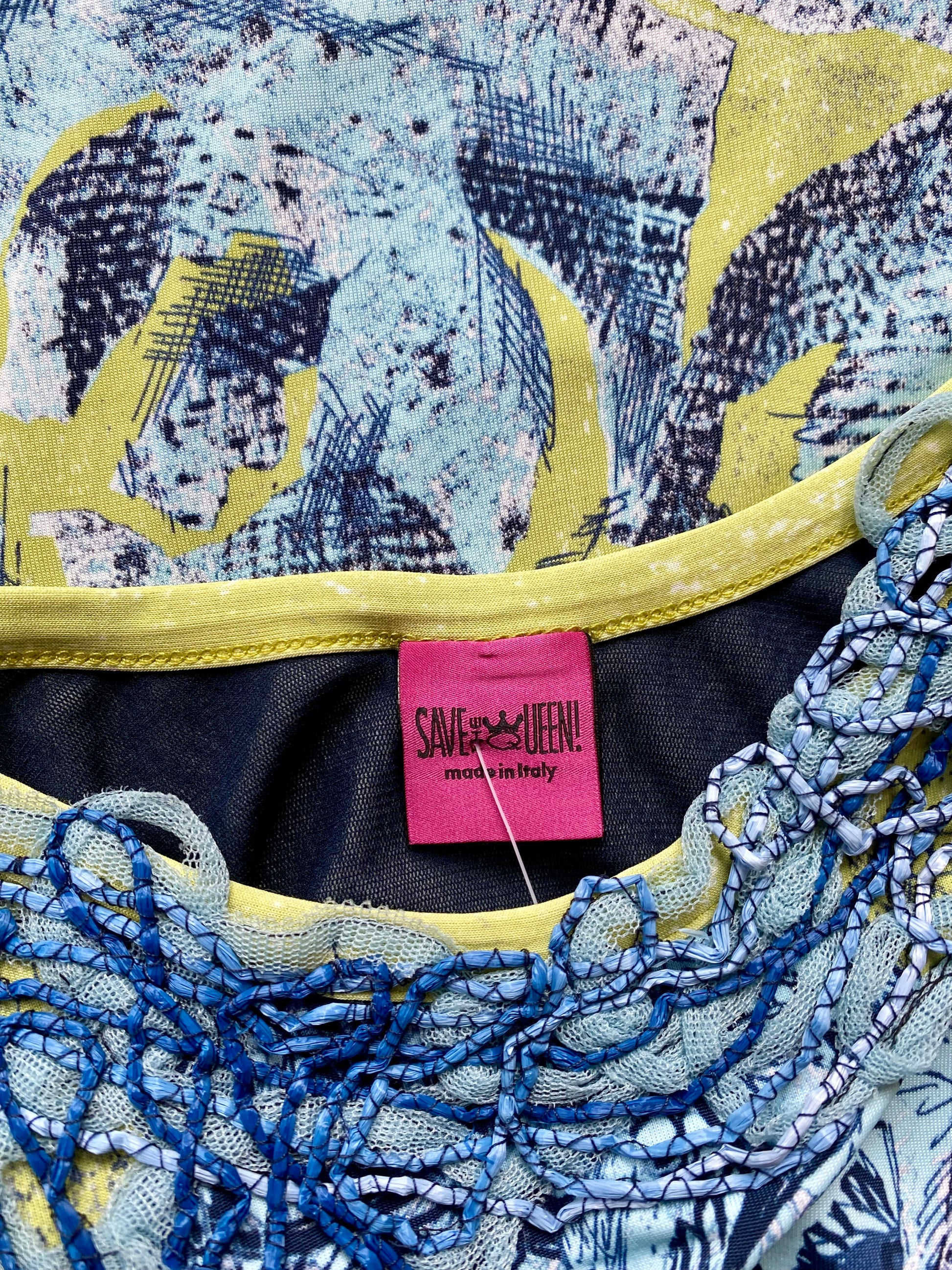 Beautiful and unique Save The Queen lime green dress with an abstract blue rose print and embroidery along the neckline. Sheer blue hemline with sequins, above elbow sleeves and knee length.