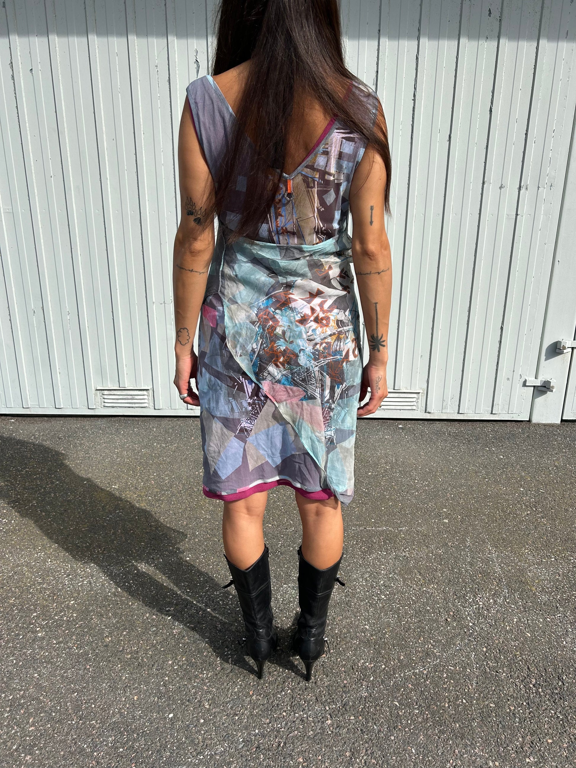 A flowy and light layered dress in asymmetrical design. Pattern in light gray, light turquoise, orange and pink.