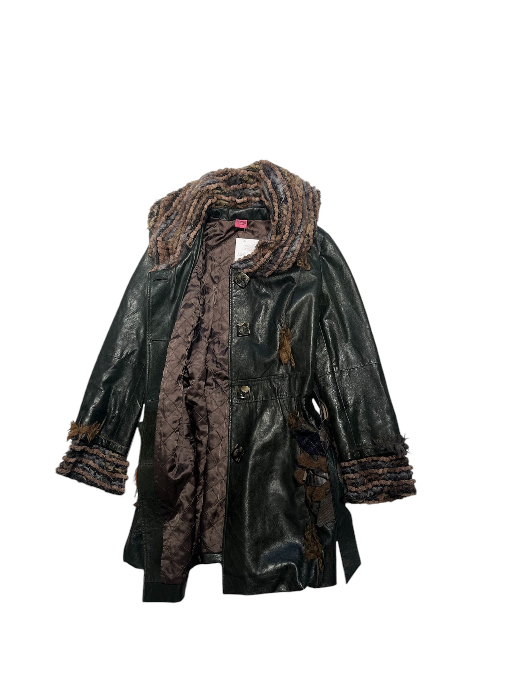 A show stopping coat from Save The Queen. The coat has amazing patchwork details in different shapes and patterns. It also has a hood in a fur material. Pockets in front. The coat closes with square buttons and a belt around the waist.