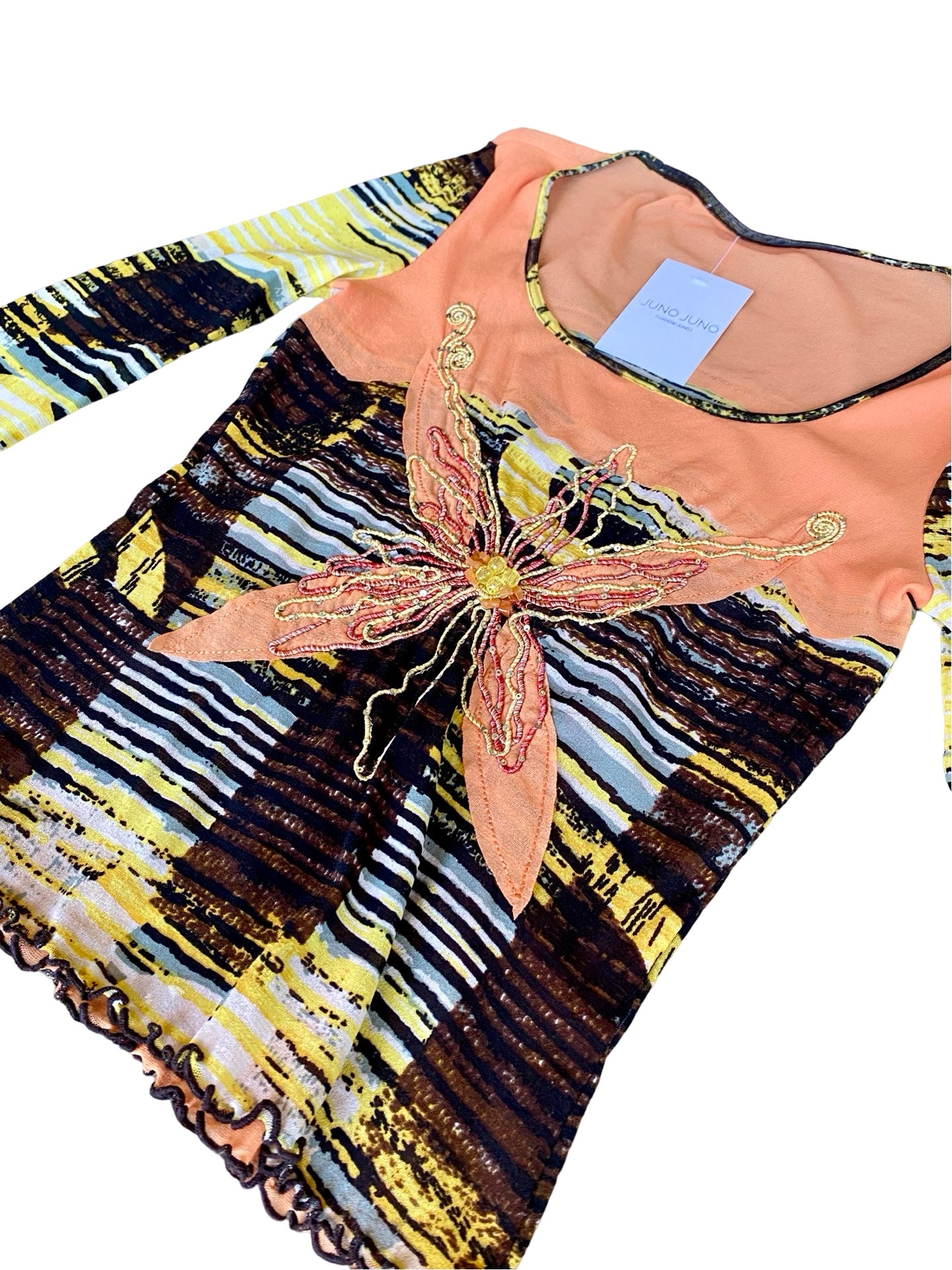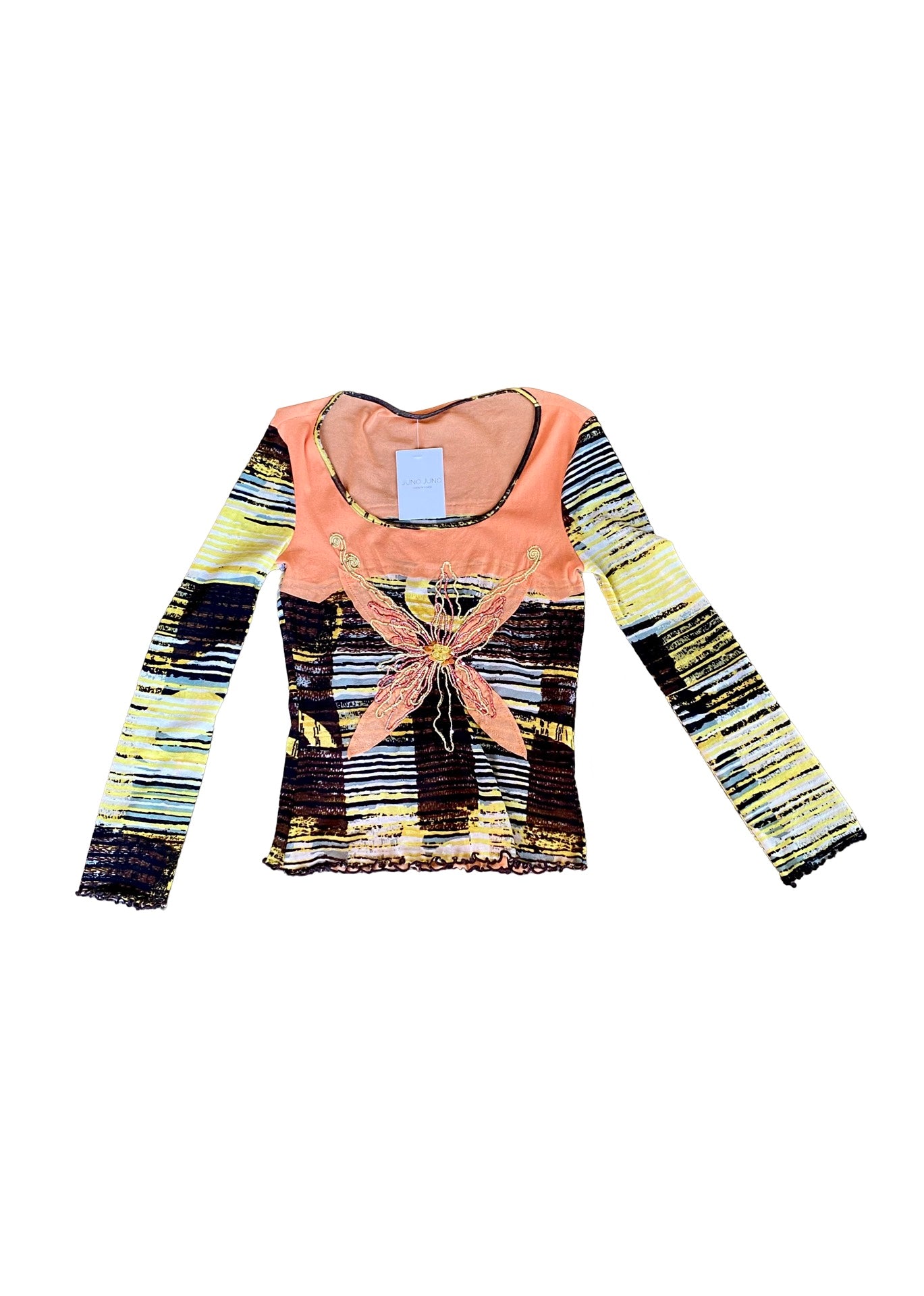 Cute butterfly top with sequin and pearl embroidery in the front. Shades of peach, yellow, brown and gray.
