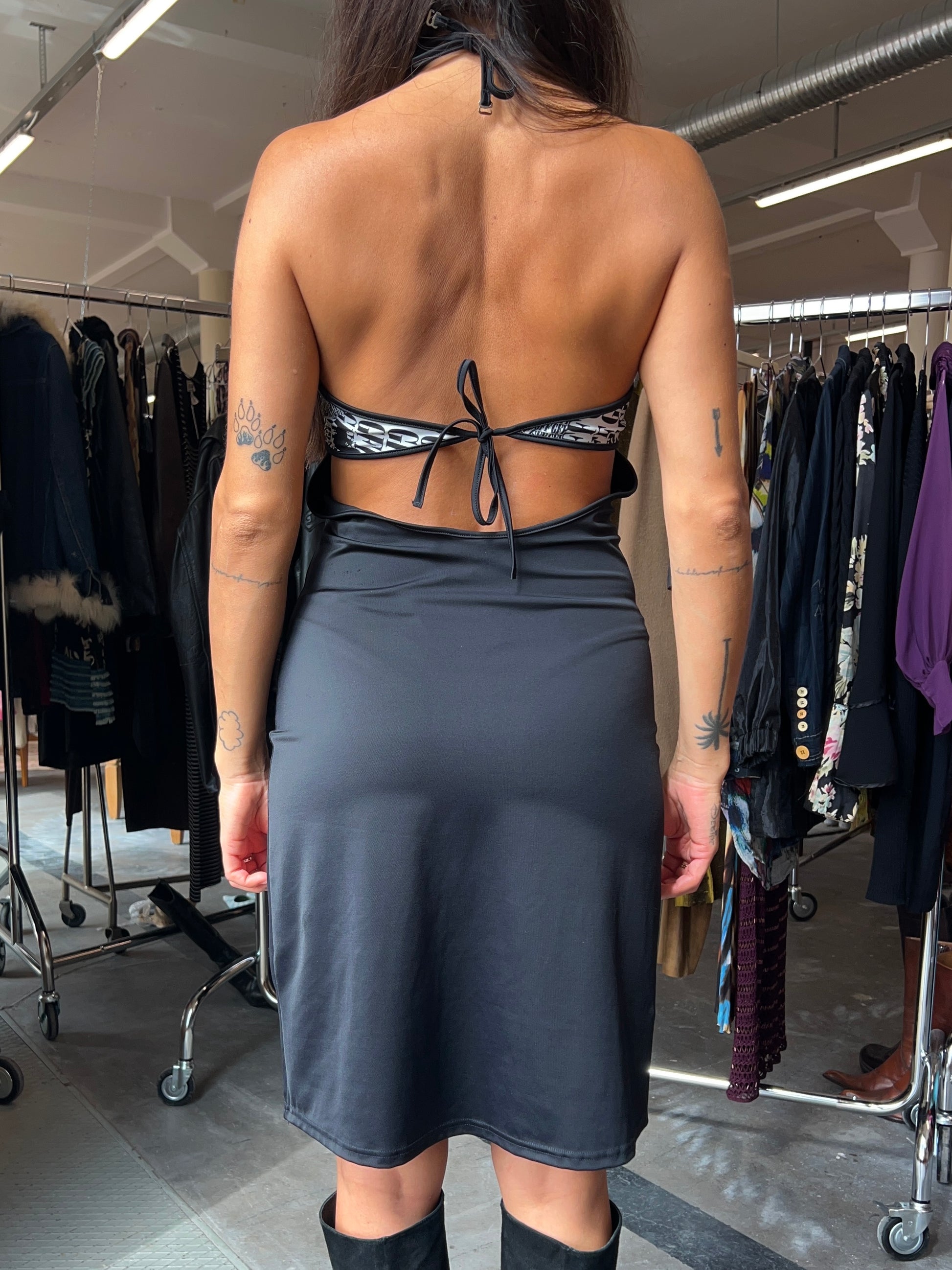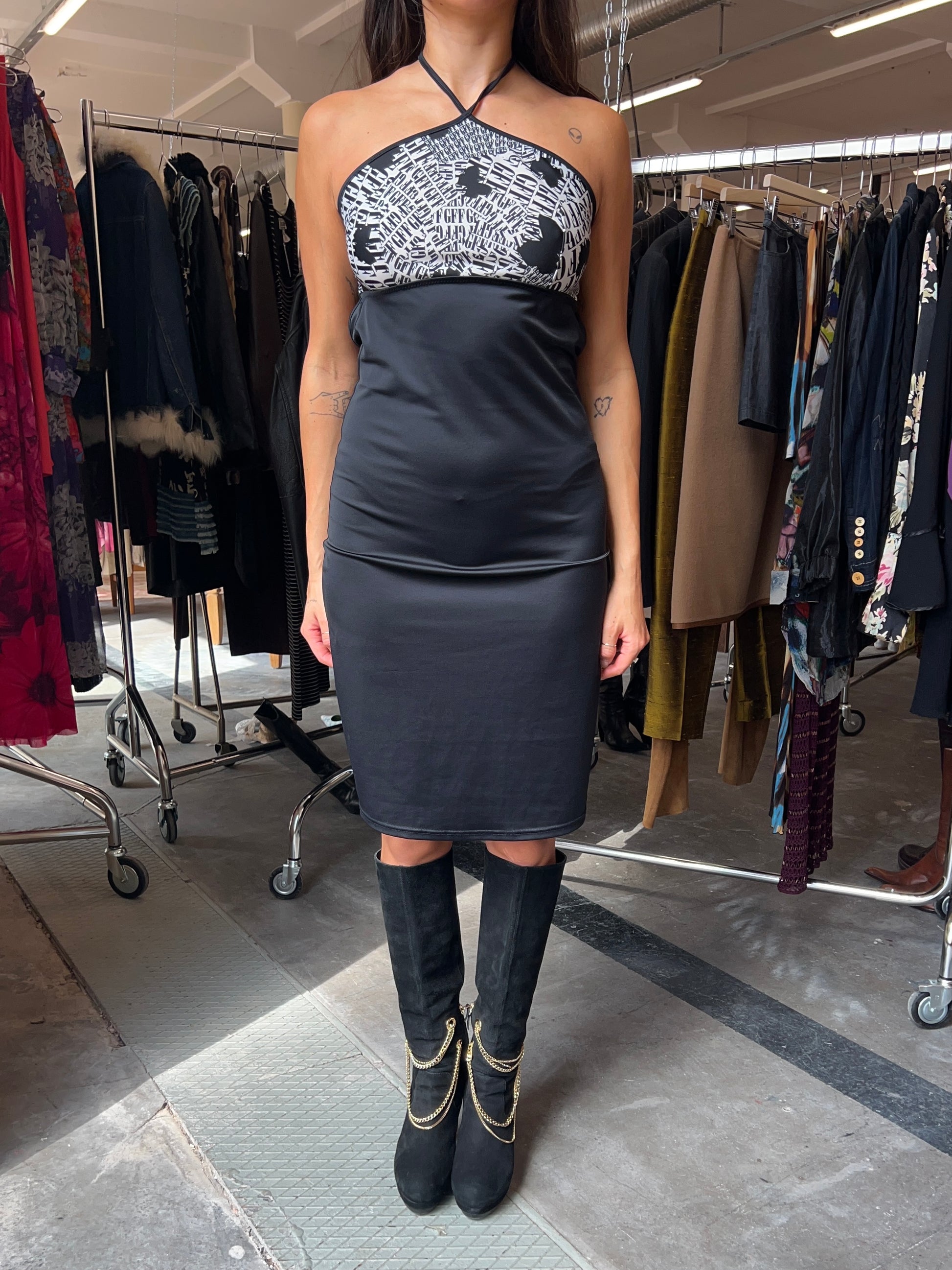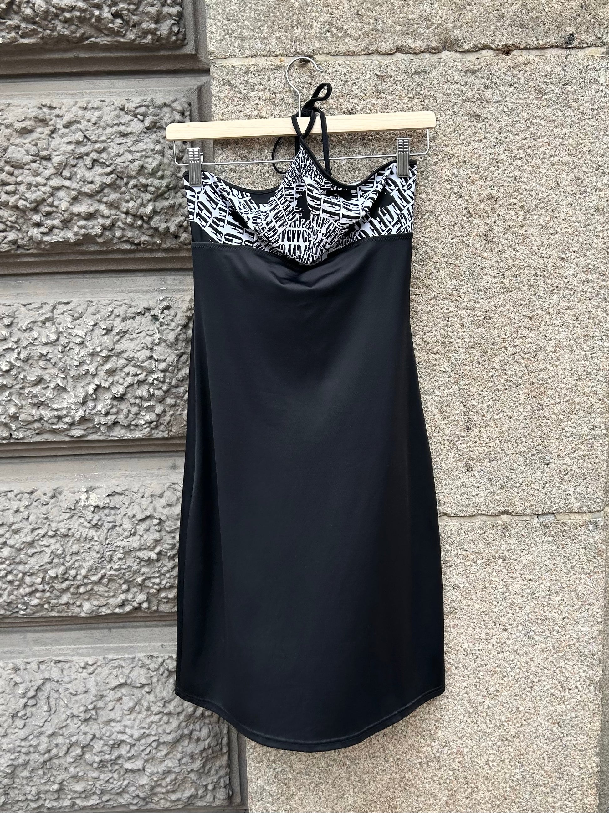 A sassy minidress in a beach bikini material, ties in back and around neck as a halter neck design. Slim fit with Gianfranco Ferre monogram on top.
