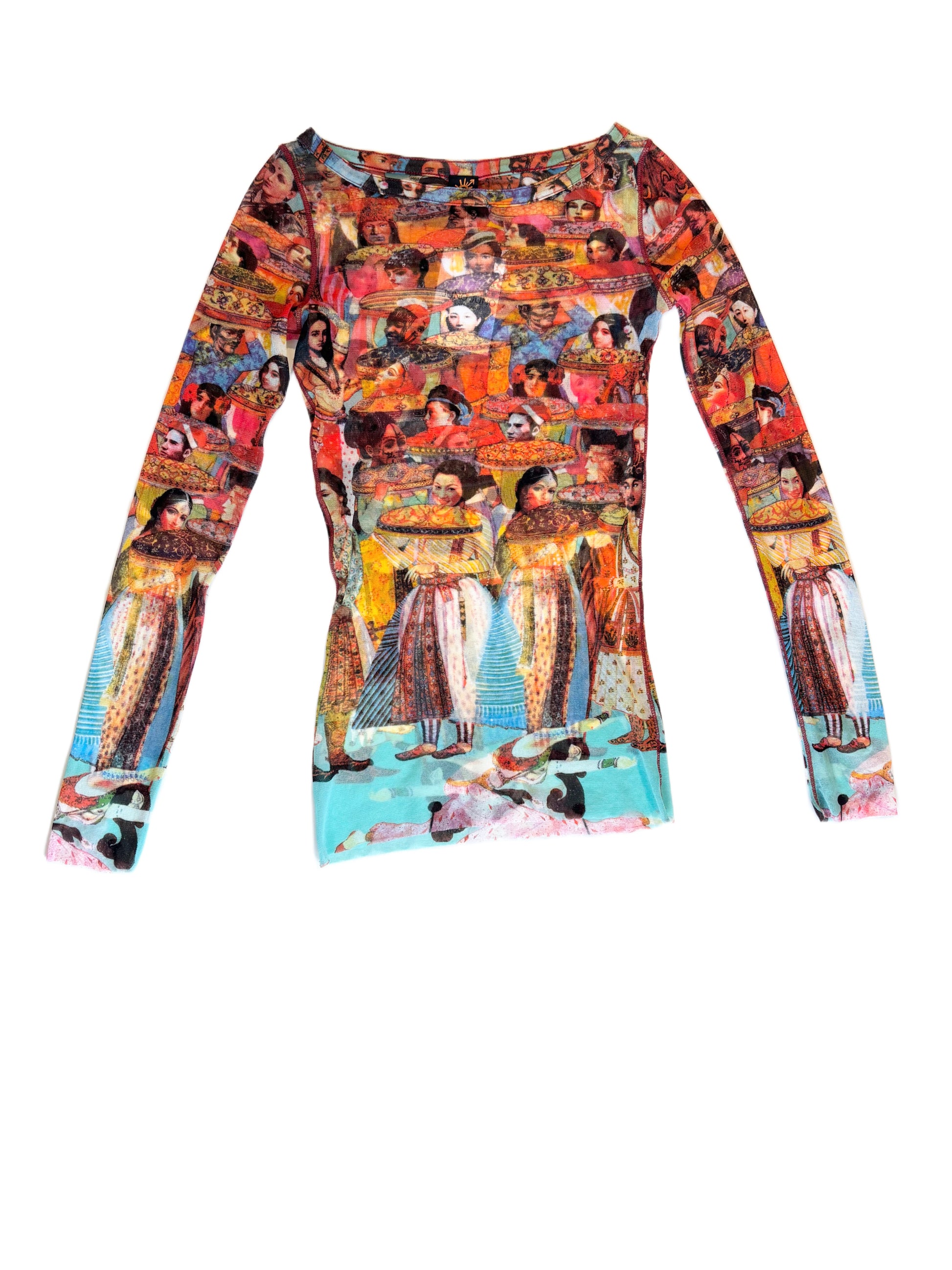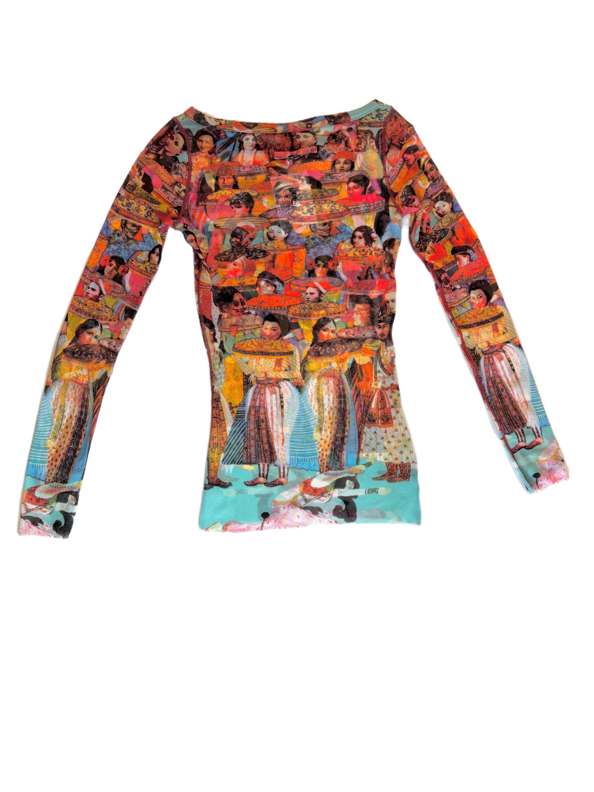 This Jean Paul Gaultier vintage mesh top is wearable art. Featuring a striking all over humanprint in vivid tones of red, orange, and turquoise, it embodies Gaultier’s signature mix of bold graphics and body-conscious design. A versatile statement piece, it layers effortlessly under a blazer or stands out on its own with denim.