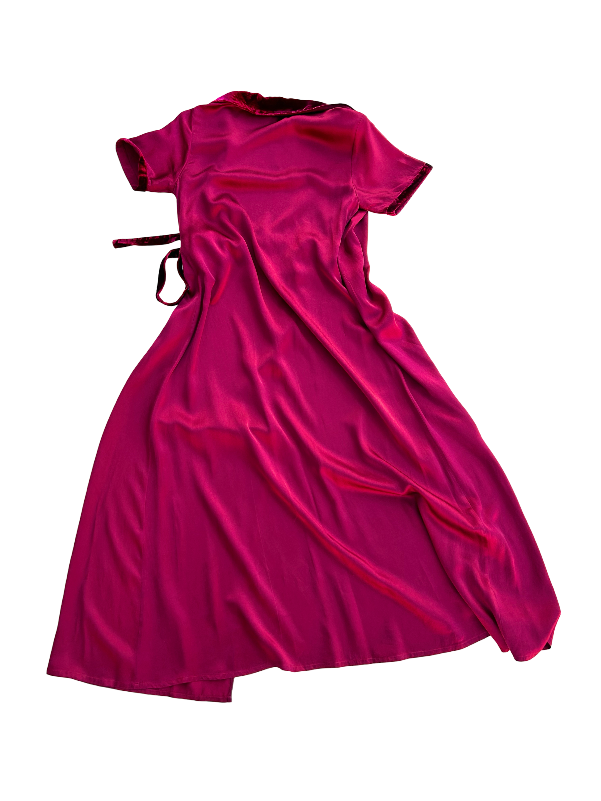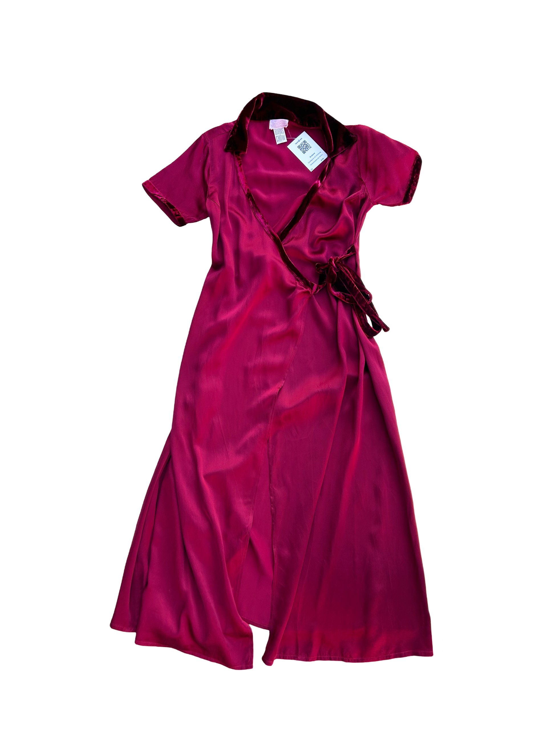 A deep and rich burgundy colored wrap dress in silk and velvet details. A line shape with collar and in mid to maxi length, ties on two places, outside and inside.