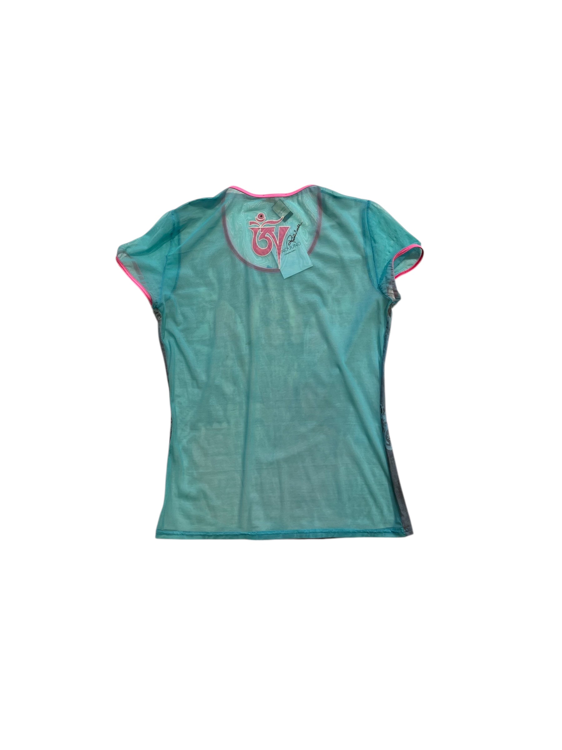 Cool printed top from Roberto Cavalli. The back and sleeves are in a turquoise mesh fabric. The top has a pink neckline with a turquoise bow, and pink hems at the end of the sleeves. It also has a print in the back with the Roberto Cavalli monogram.