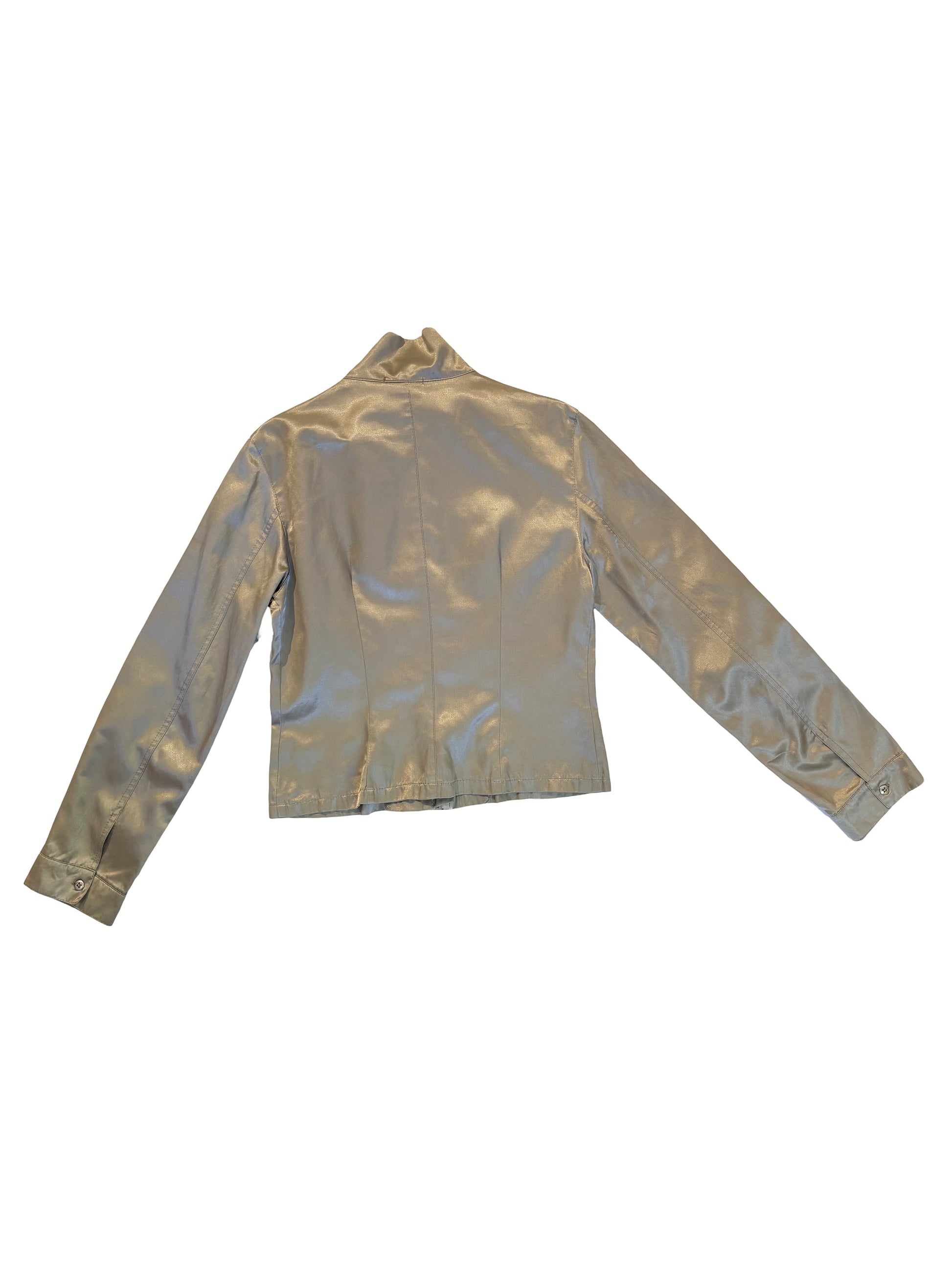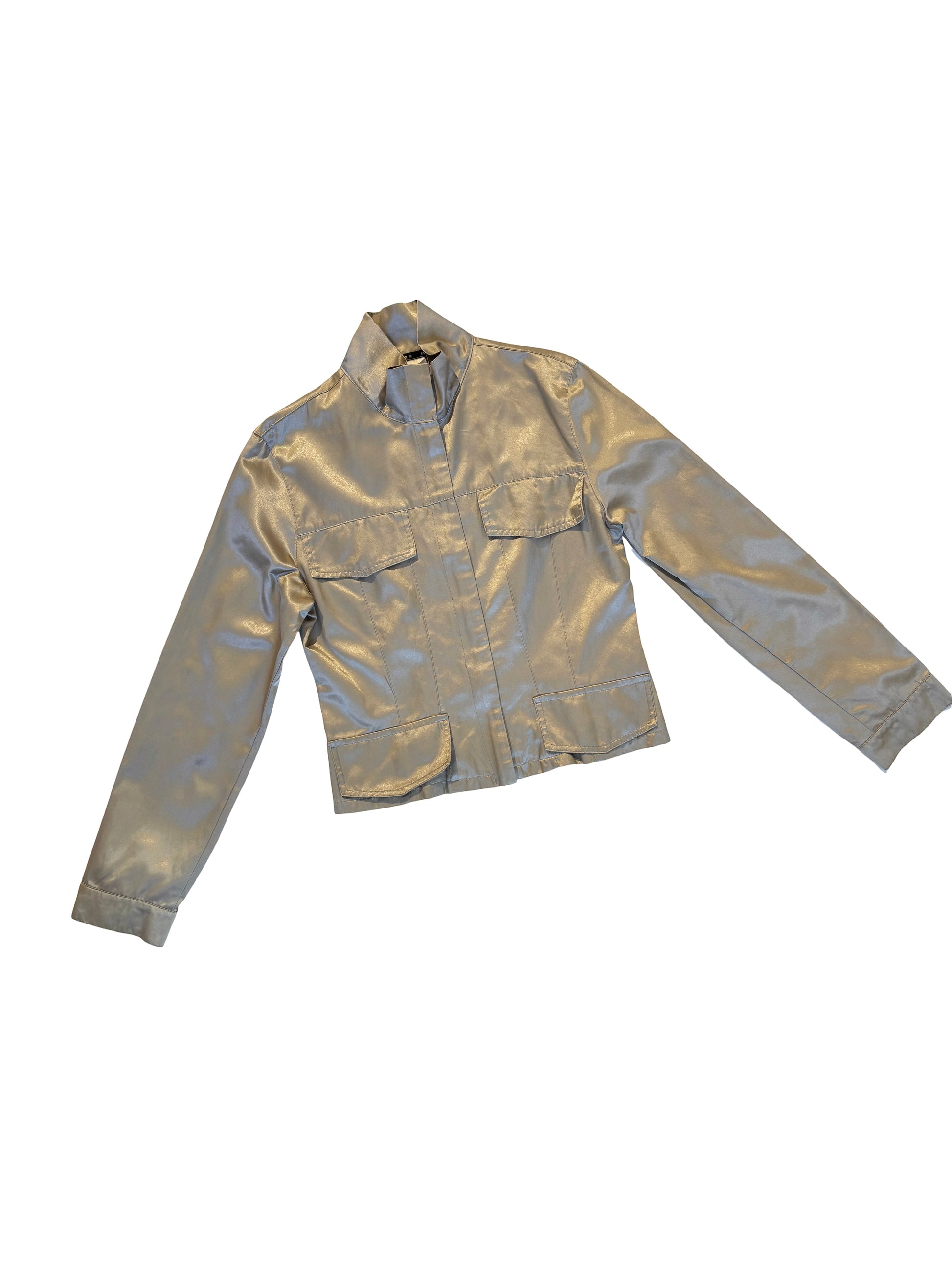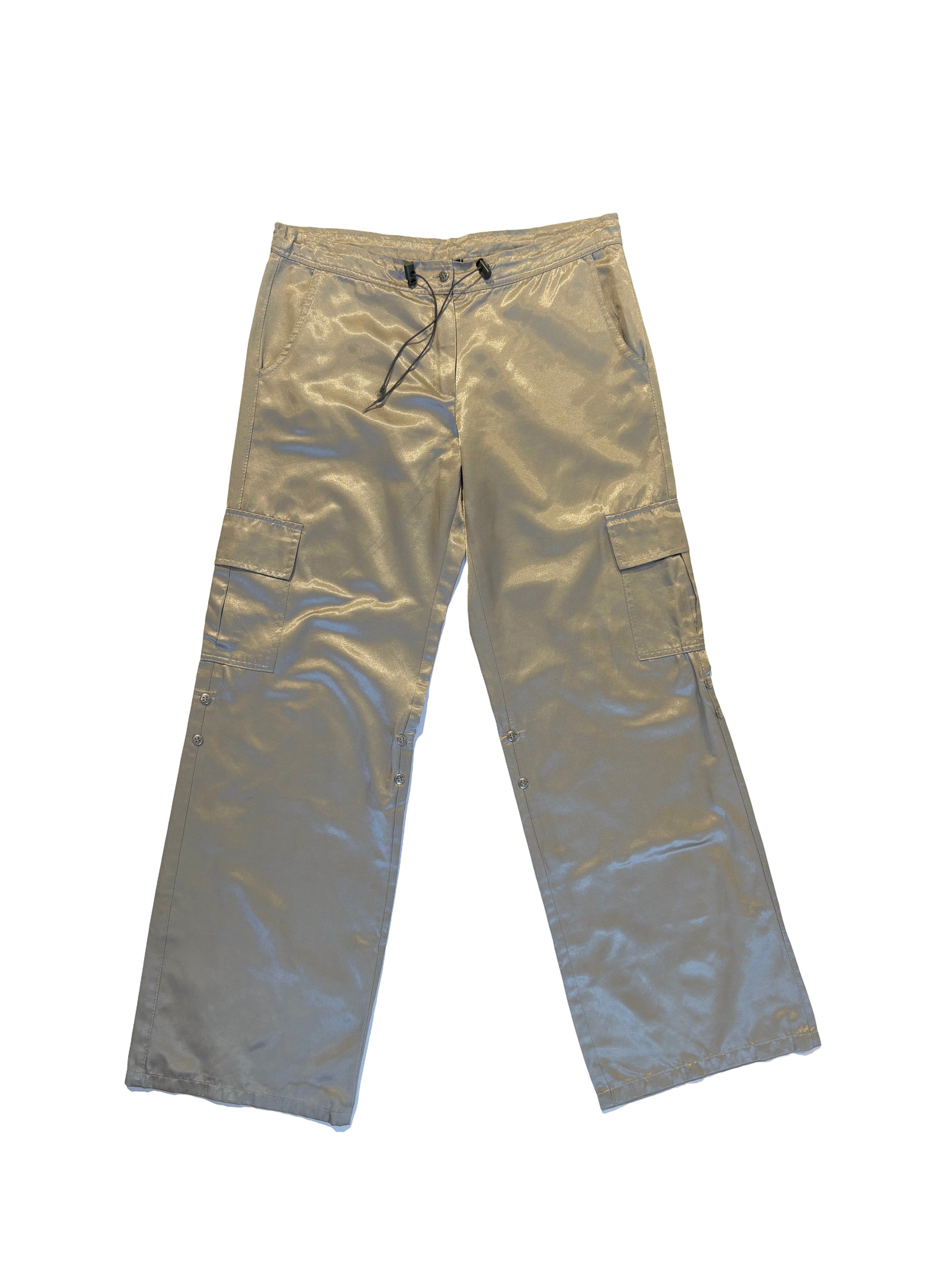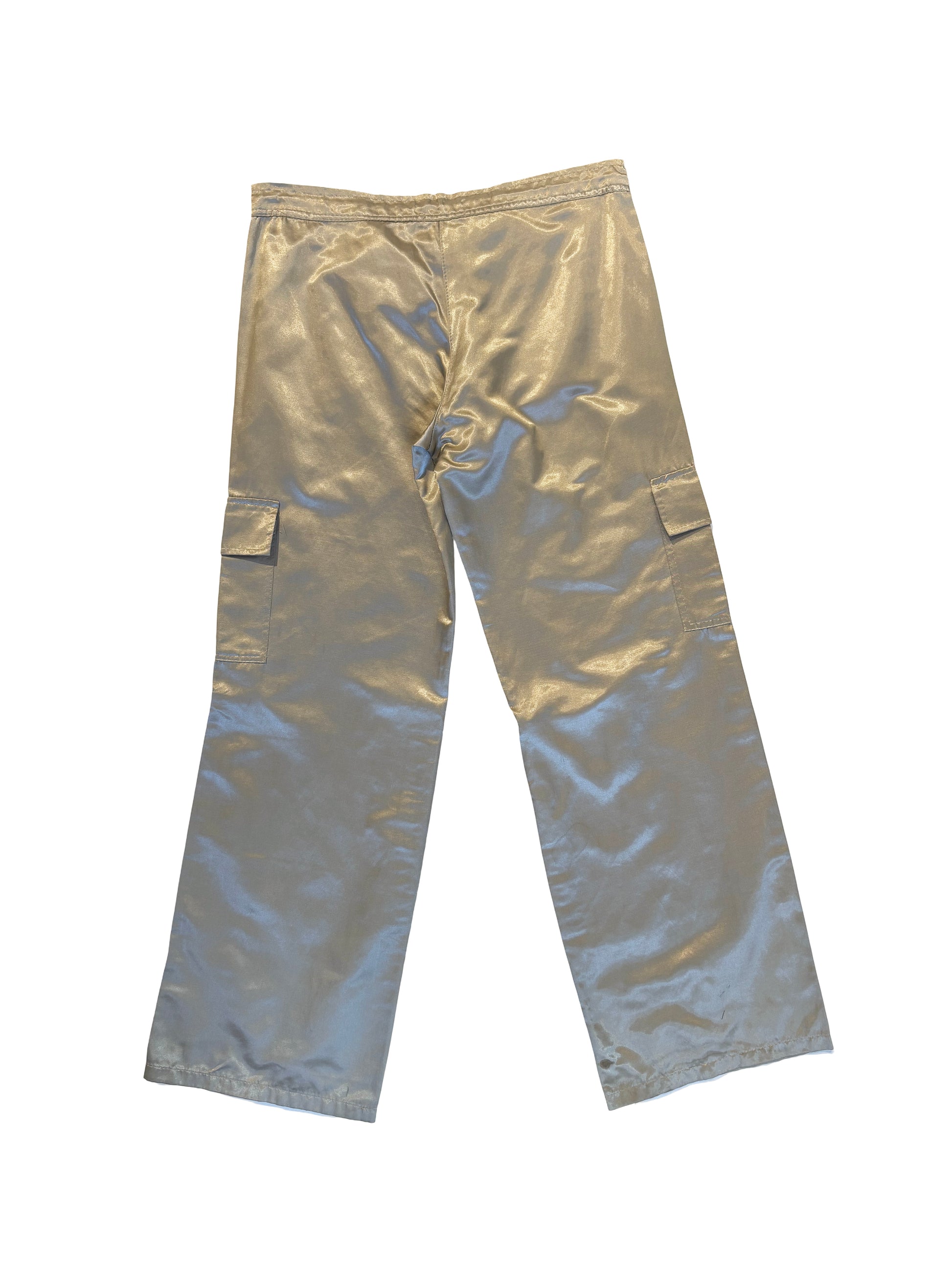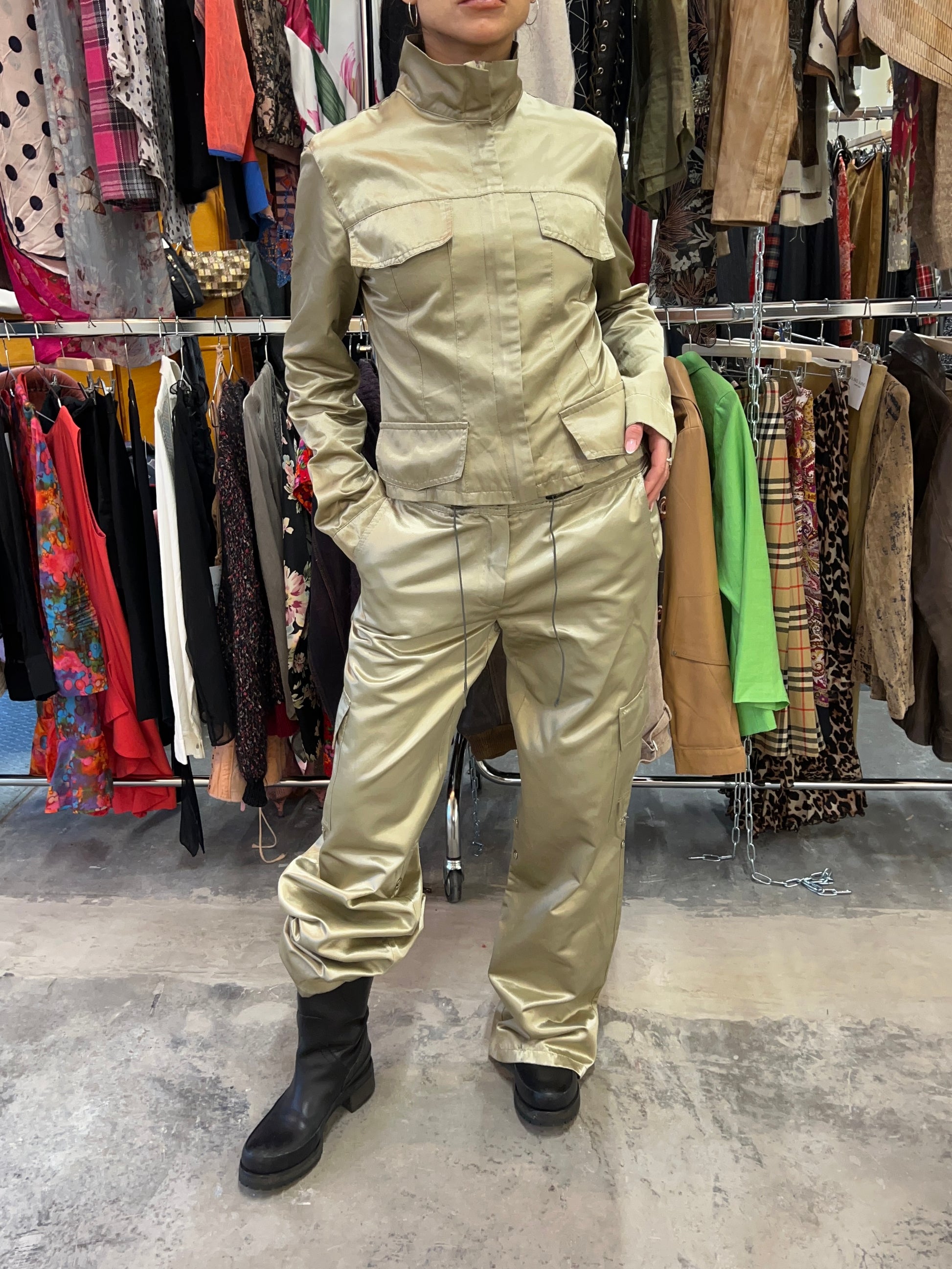 Ultra-slick and future-leaning, this early 2000s matching set features a high-shine finish and a strong utilitarian cut. The cropped jacket comes with oversized chest pockets and an exaggerated funnel collar, while the pants offer a low-rise fit with gathered legs and drawstring details. Think Matrix-meets-Gwen Stefani – a true cyber-streetwear moment.