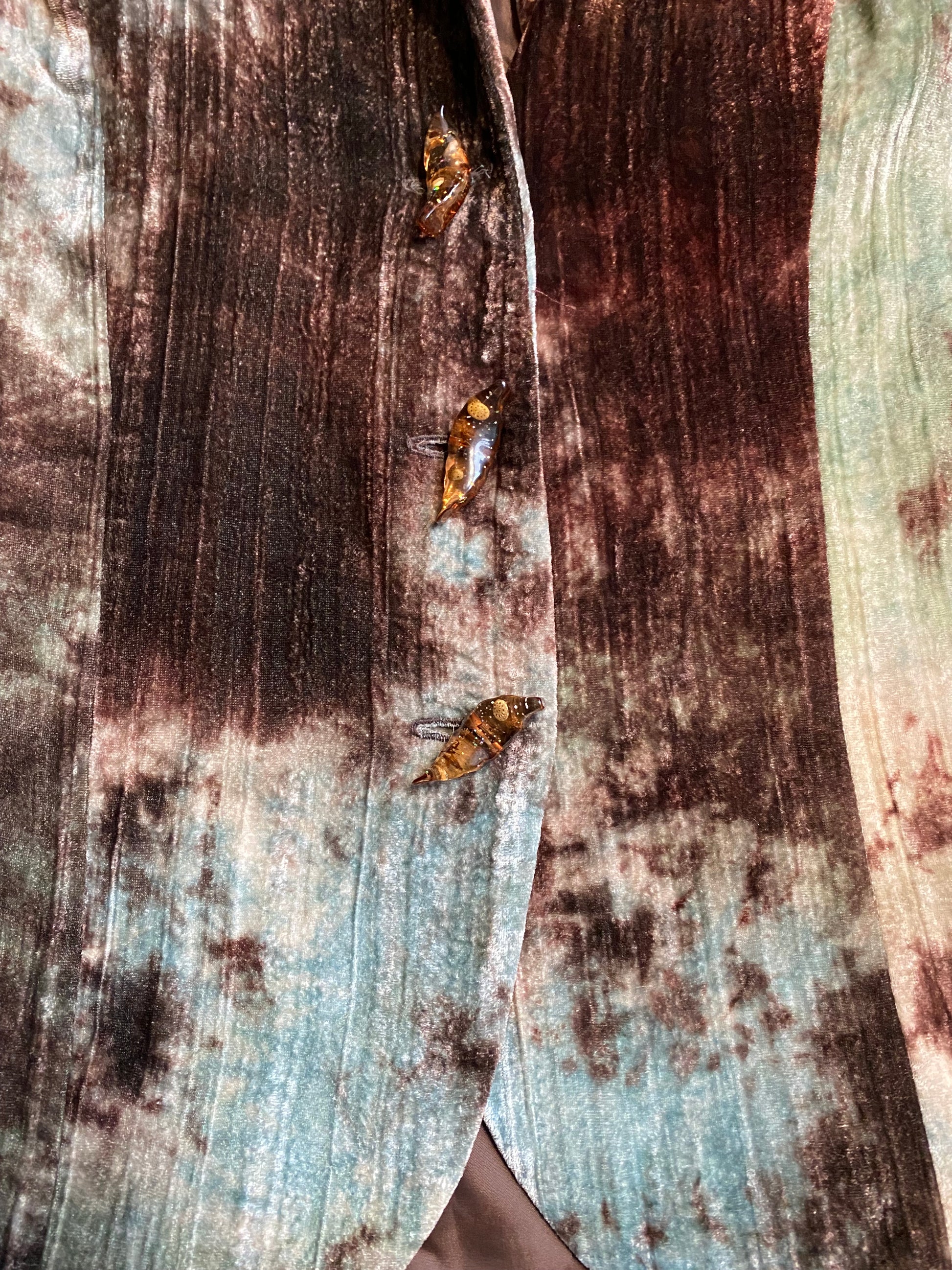 This soft velvet blazer goes in shades of brown and turquoise in a dreamy mix. Both unique and classic. Formal and casual.