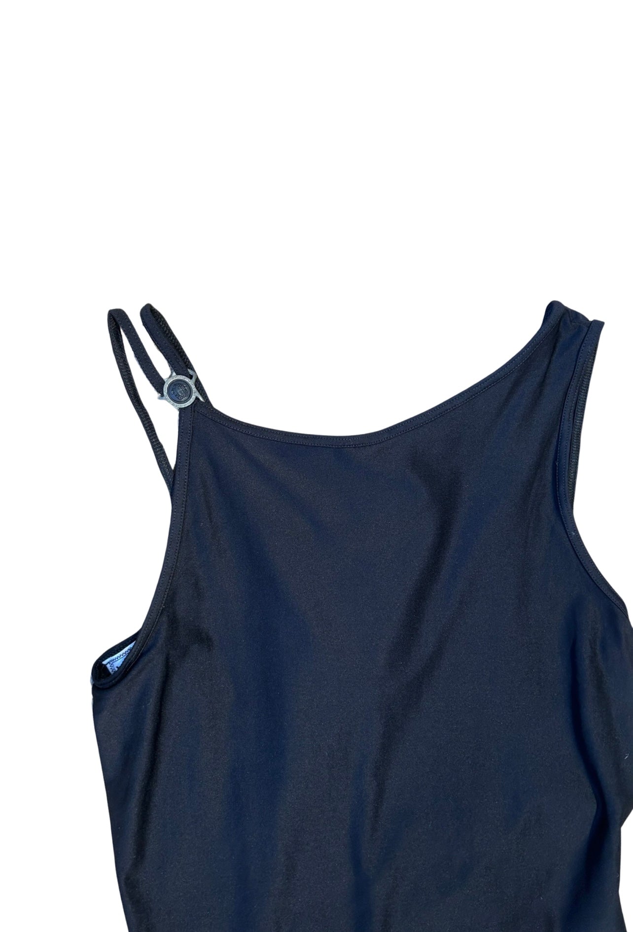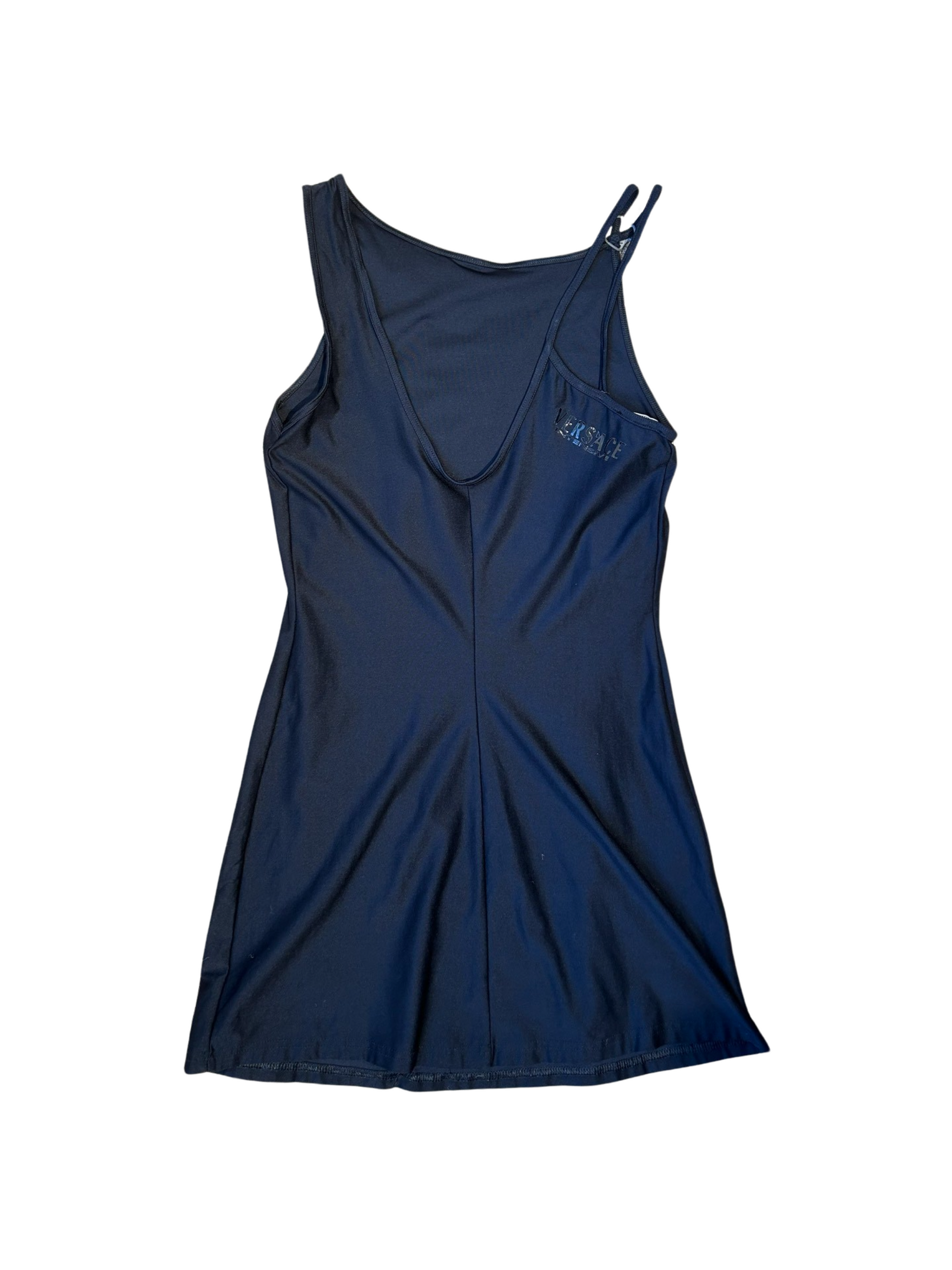 Versace little black dress in mini body con style. Asymmetrical details with the iconic Versace icon in steel as a shoulder detail. Low back with “Versace” printed on to the back.