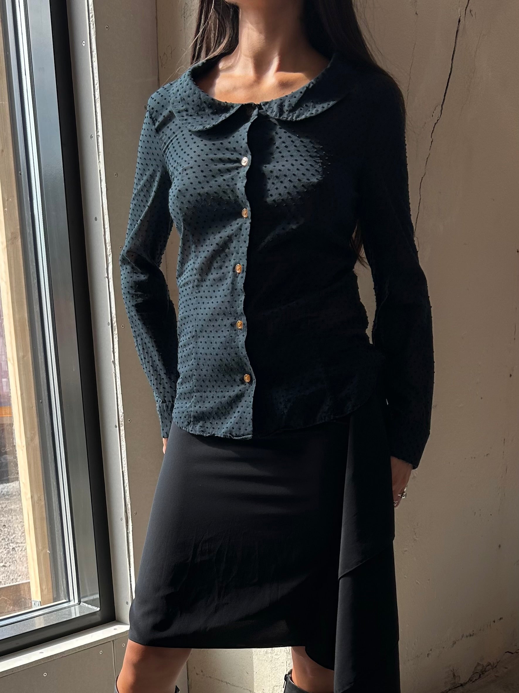 A cute collar blouse by Vivienne Westwood. Sheer midnight blue fabric with polka dot details.
