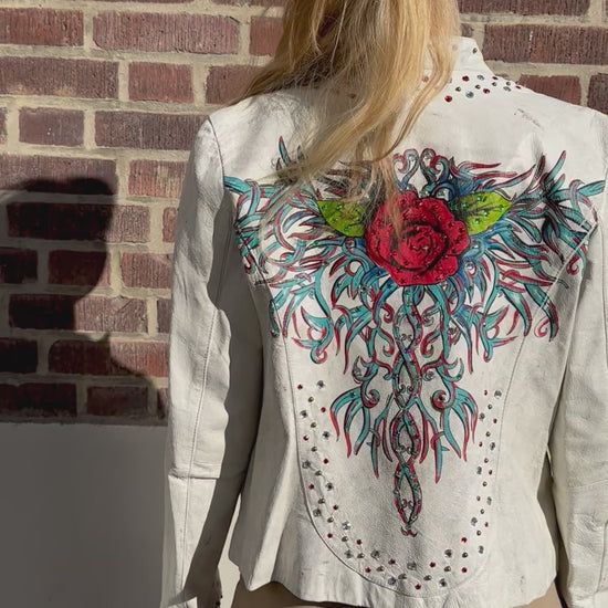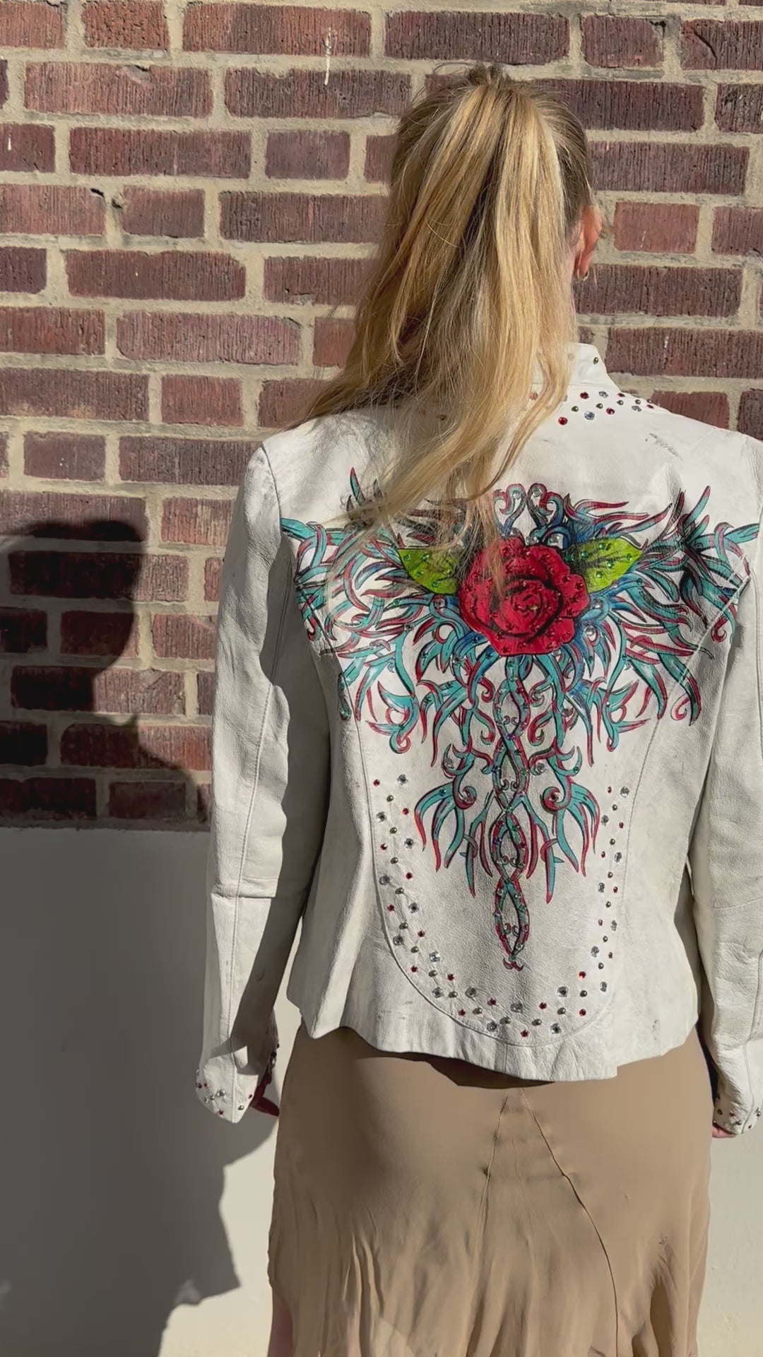 This Wilsons Leather jacket channels rock-chic energy with a refined twist. Crafted in supple whits leather, it’s finished with studded/rhinestoned detailing across the front, sleeves, and cuffs. It has a big tattooprint on the back.