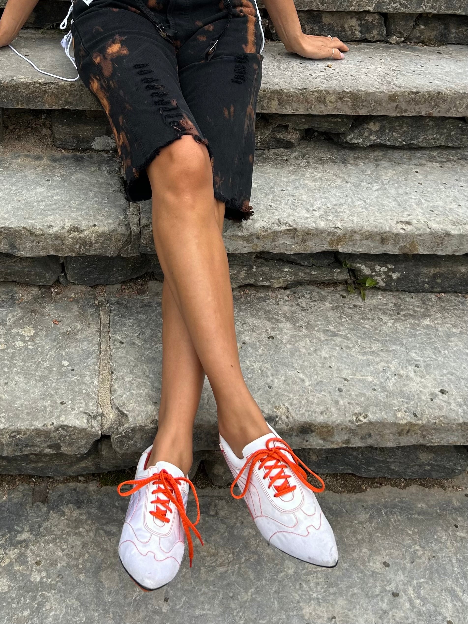A unique part of kitten heels in moto design from Xti. A comfortable short kitten heel with rubber sole with studs. A mix of fabrics and bright orange laces.