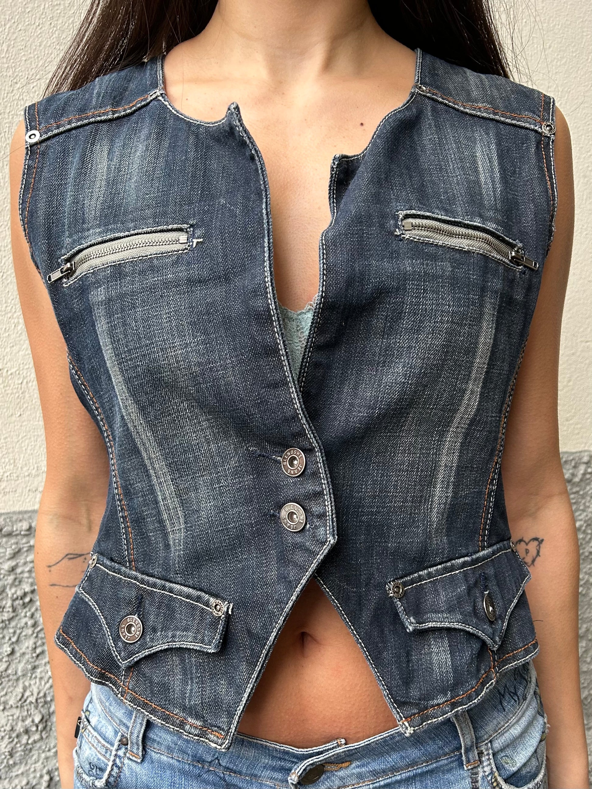 This sassy denim vest by Bendshe jeans in a blue/green denim wash with zipper and pocket details is a perfect compliment to any cute dress or fierce all denim look.