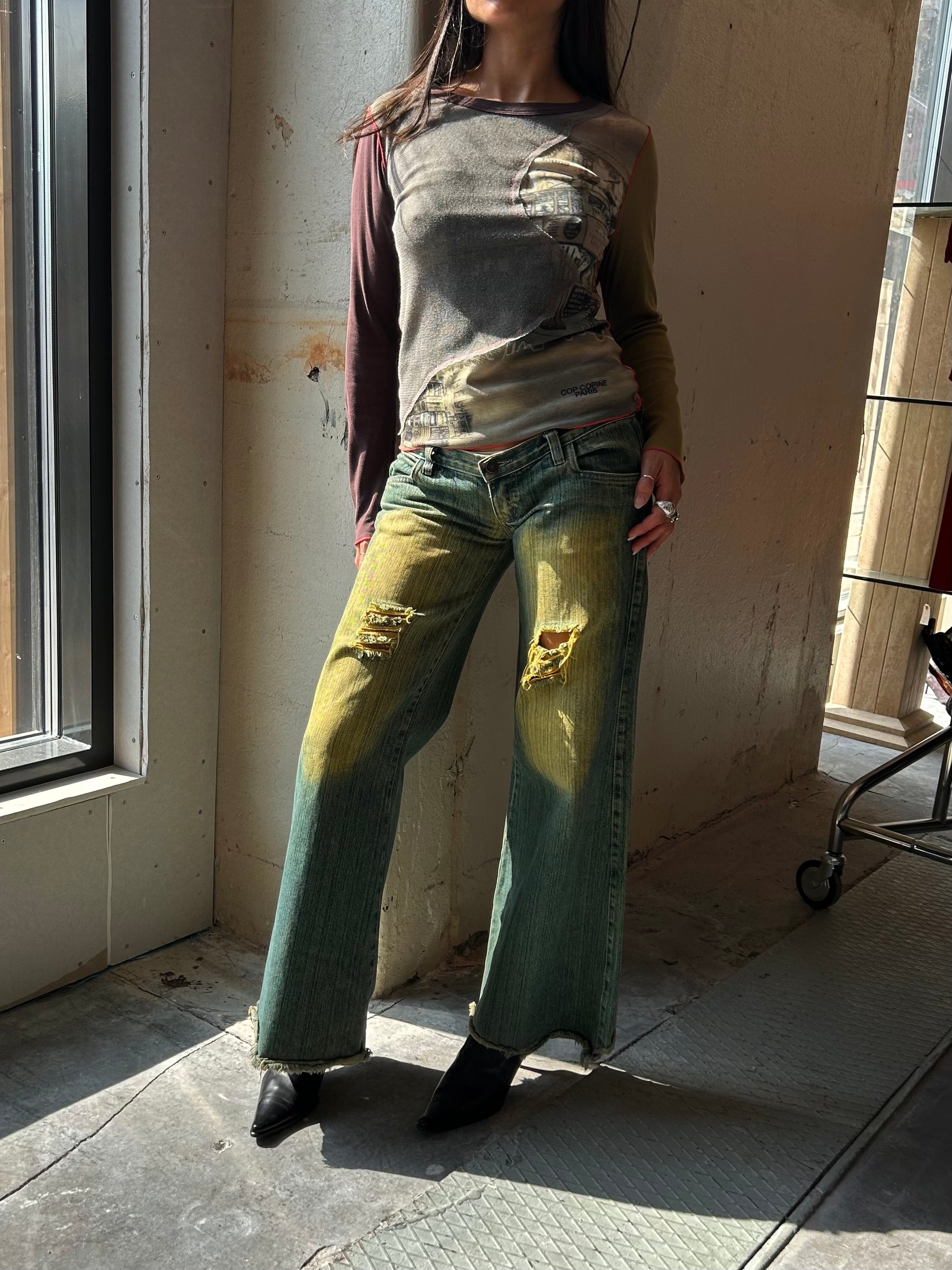 A sassy pair of jeans in a low waist and distressed greenish color to the denim, tight around waist and bum, big and flared on the bottom.
