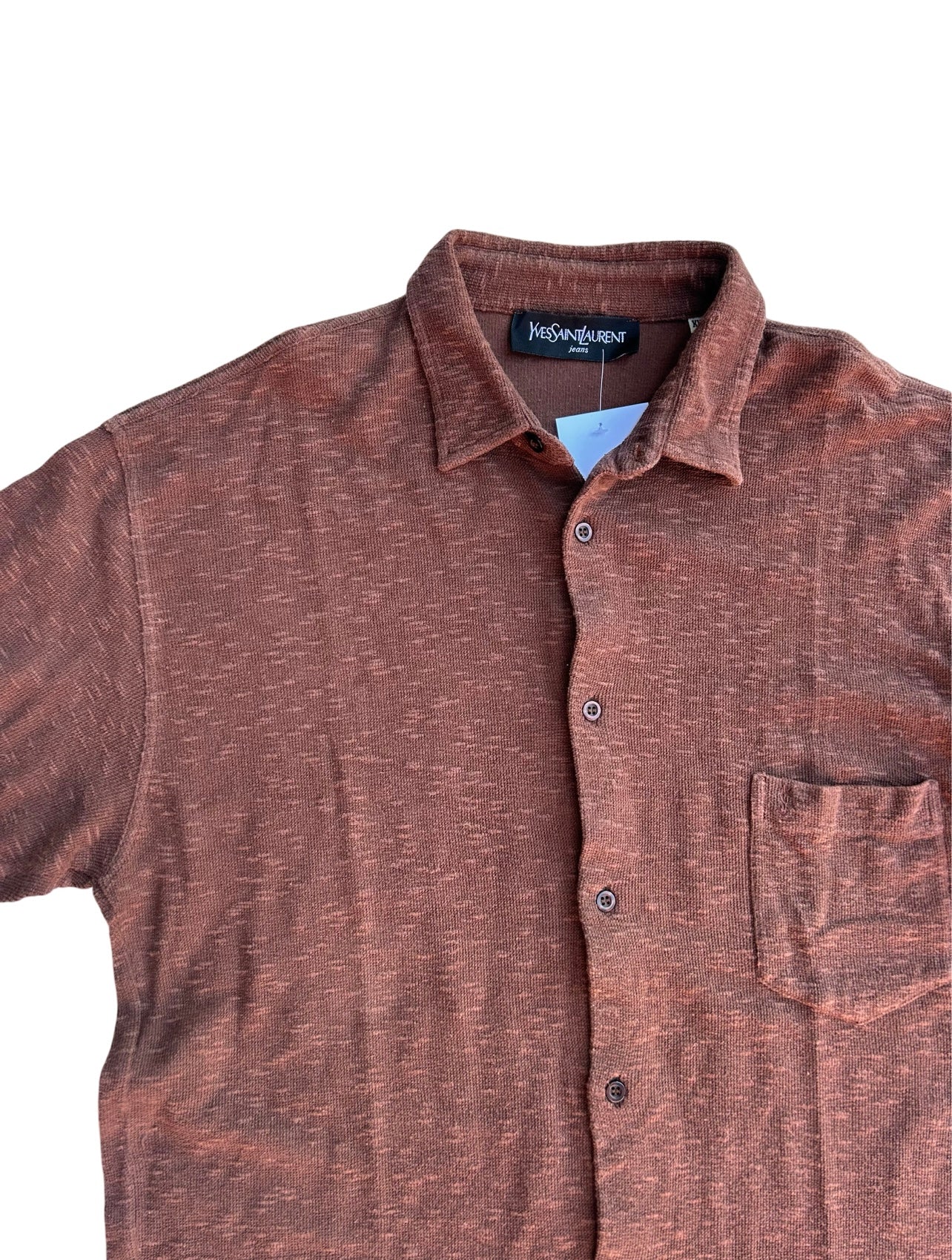 Summer vibe in a shirt! A terry cloth fabric in a deep brown color, button down and short sleeve by Yves Saint Laurent.