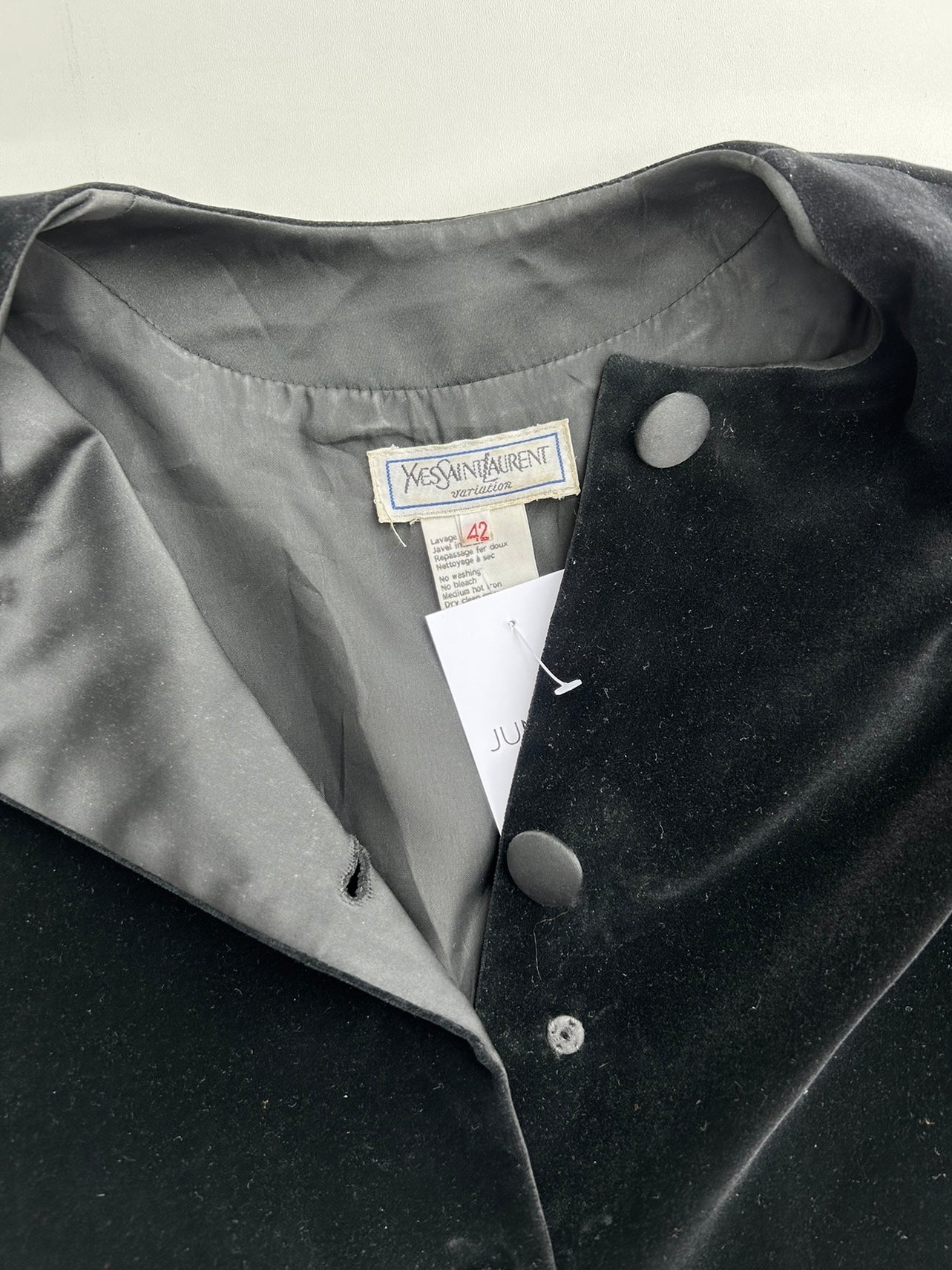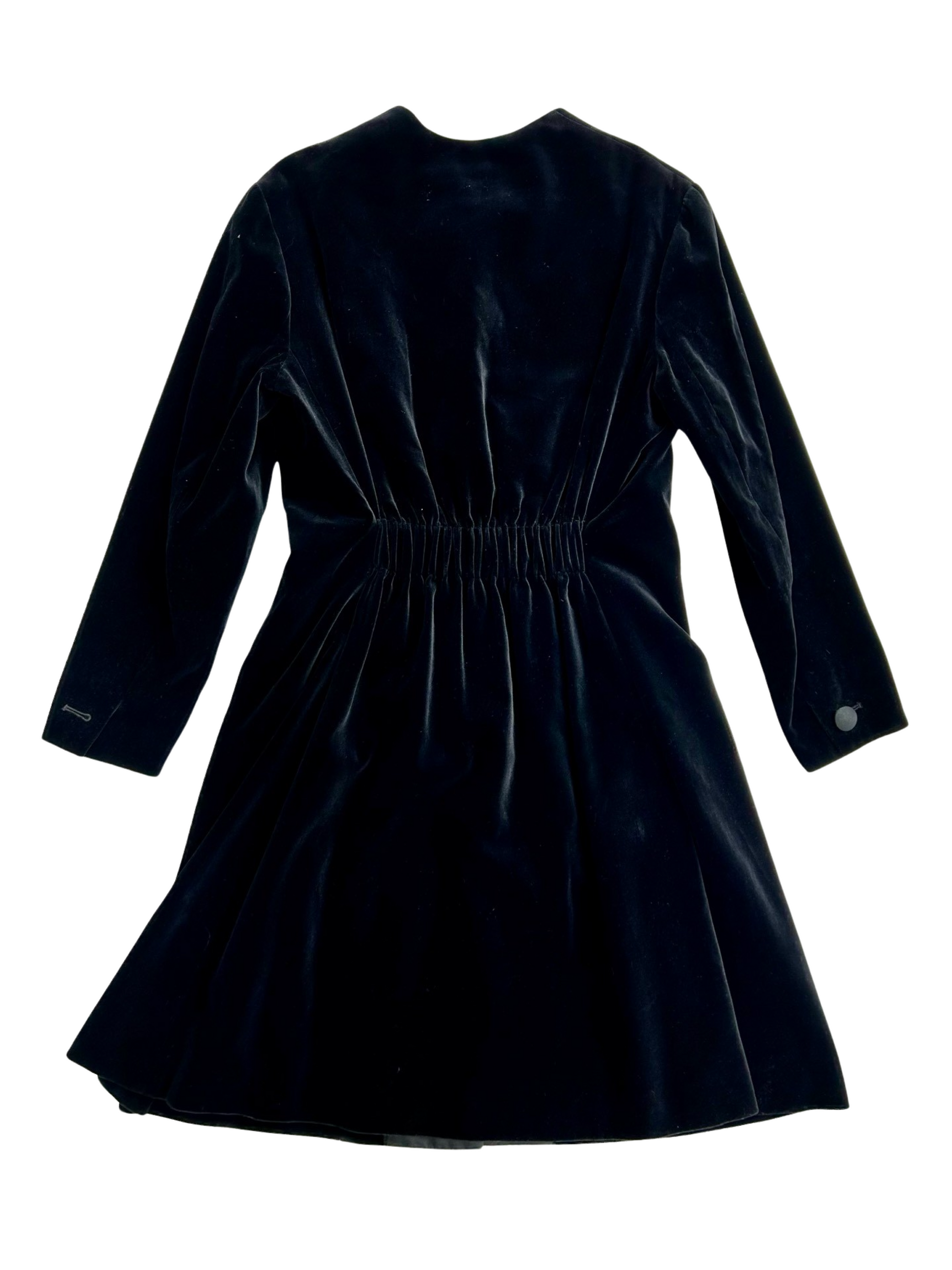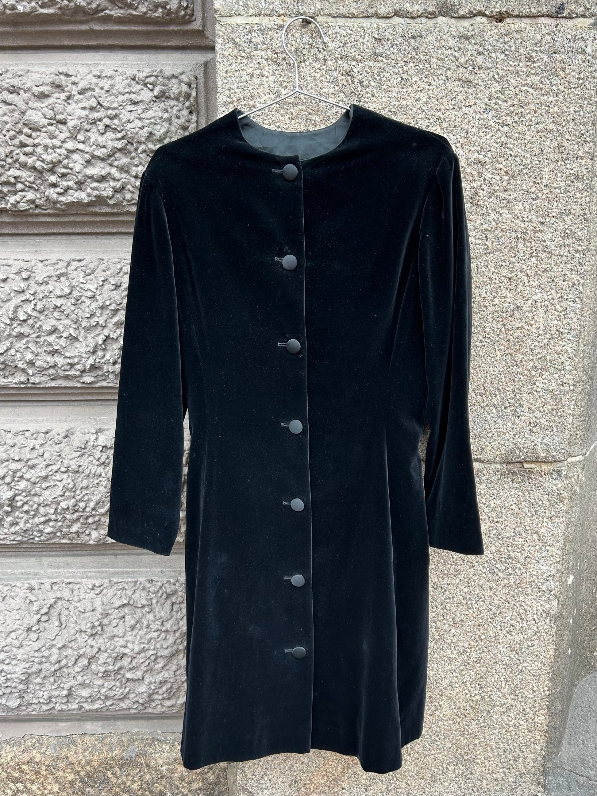 Vintage YSL piece in a beautiful romantic black velvet, wear it as a dress or coat. A classic round neck and buttons in the front, a rushing in the back for a fitted waist.